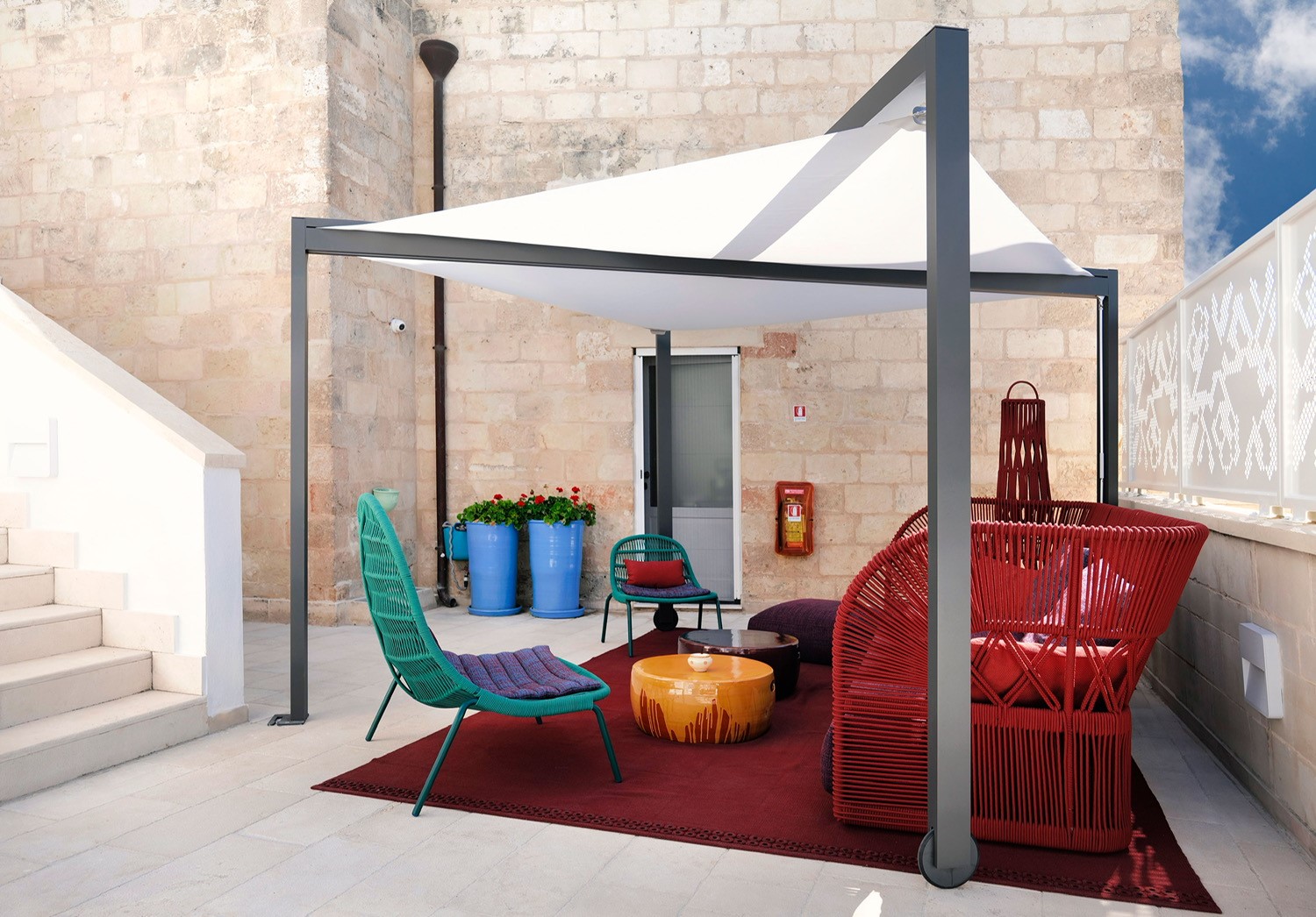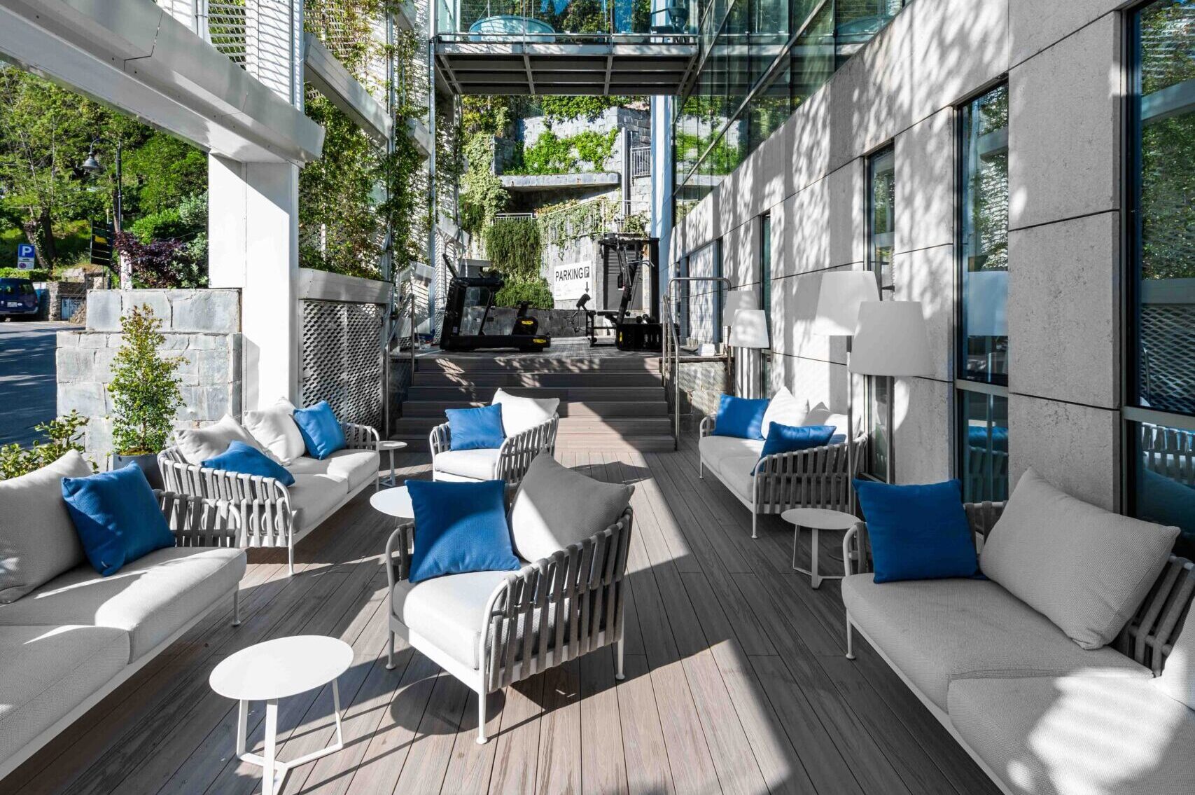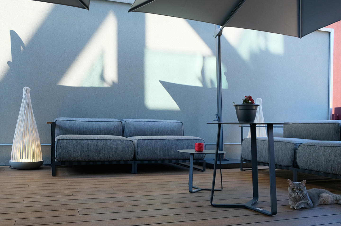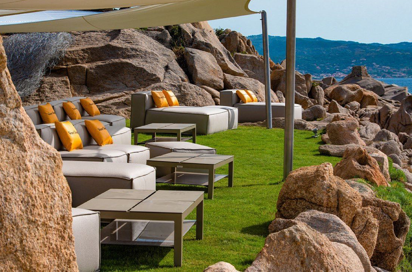 The large living areas of the terraces, on the other hand, are furnished with a mix of Moon alu seats with fabrics in soft, sober and refined colors.