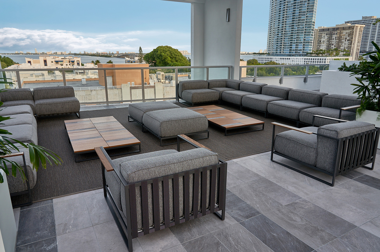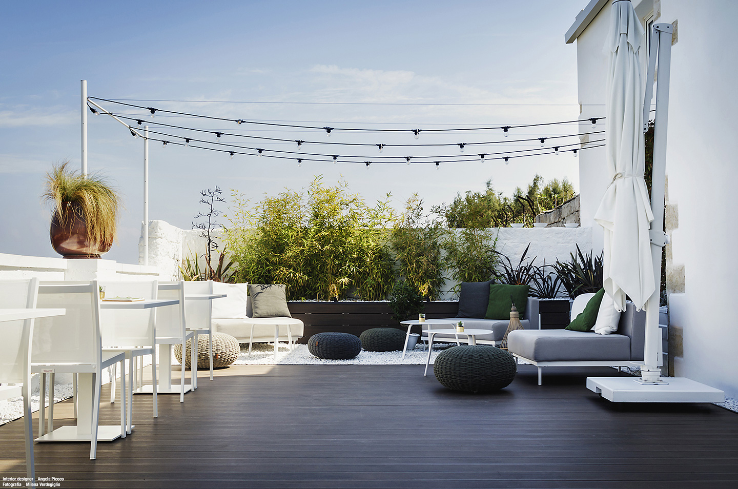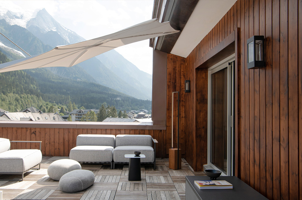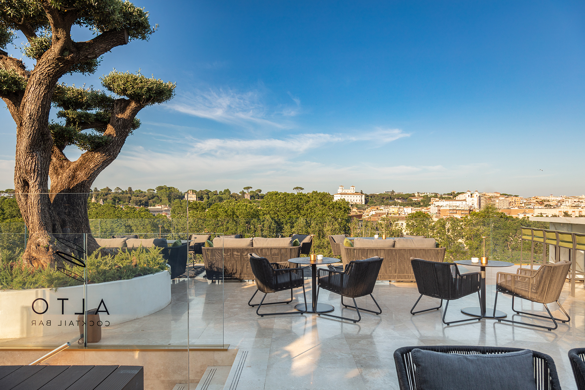 The large living areas of the terraces, on the other hand, are furnished with a mix of Moon alu seats with fabrics in soft, sober and refined colors.