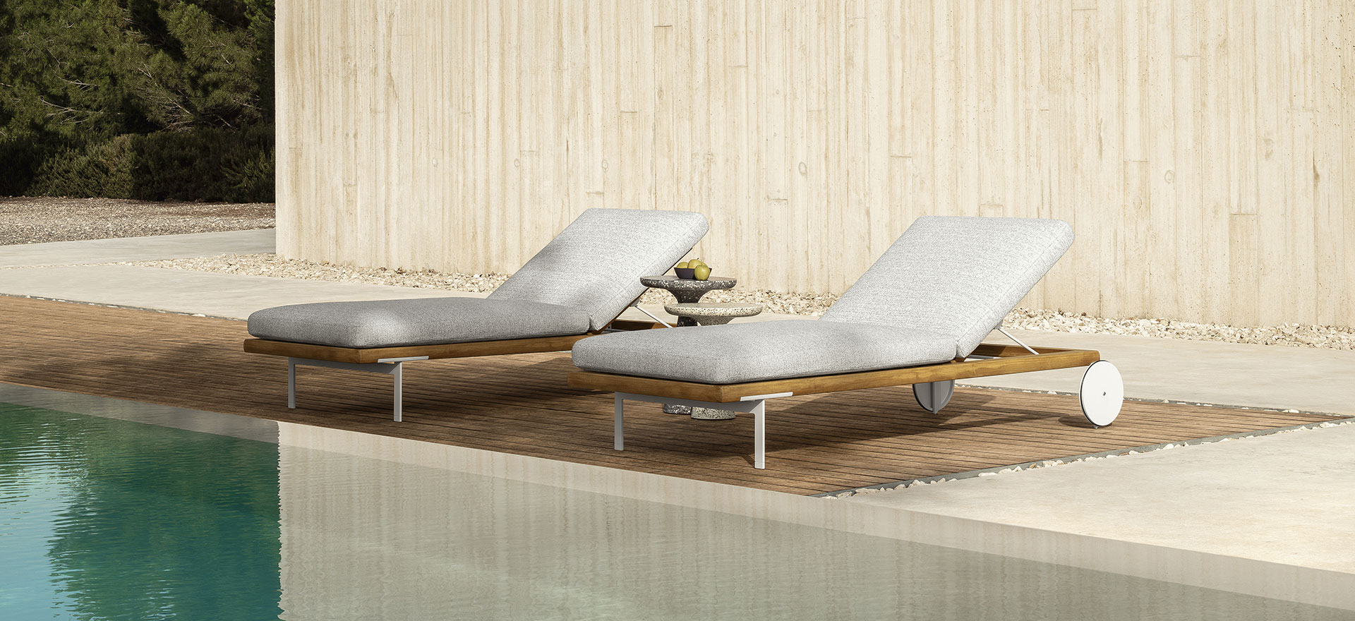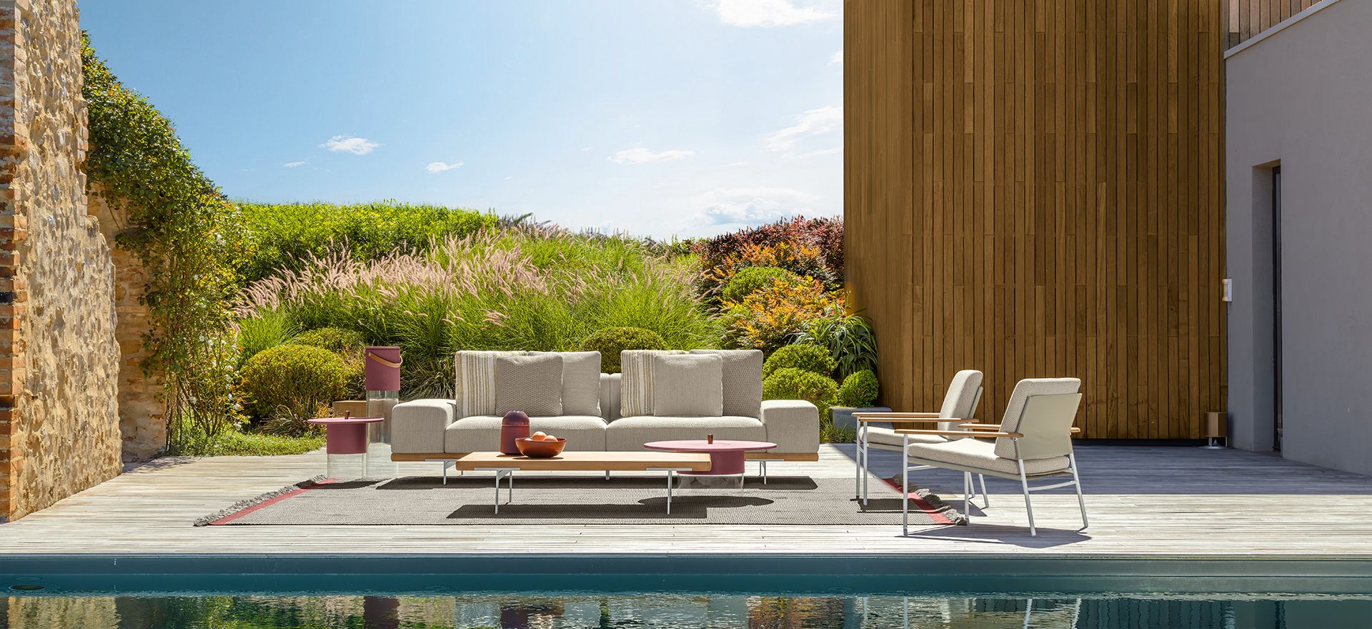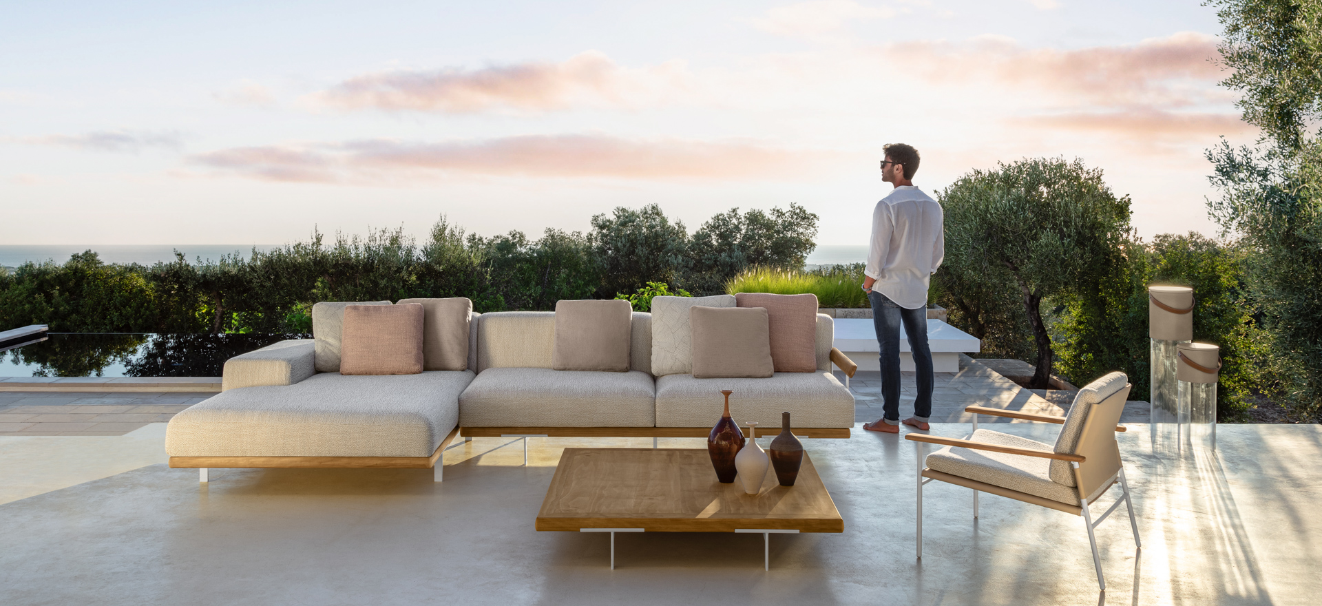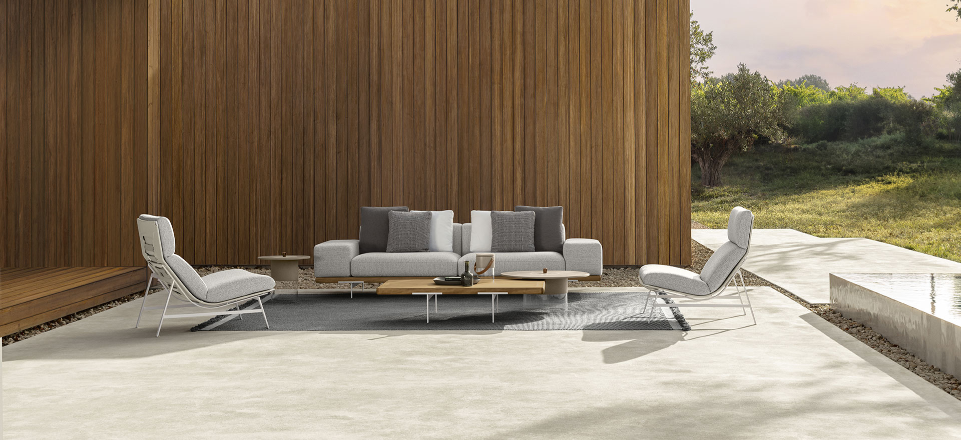 An unusual modularity that, starting from delicate aluminium feet, develops horizontally into a solid frame in Accoya wood. The geometric and linear cushions, of different sizes, are able to create different combinations and scenarios. The result is a collection with a restless soul that can give character to outdoor environments in constant change.