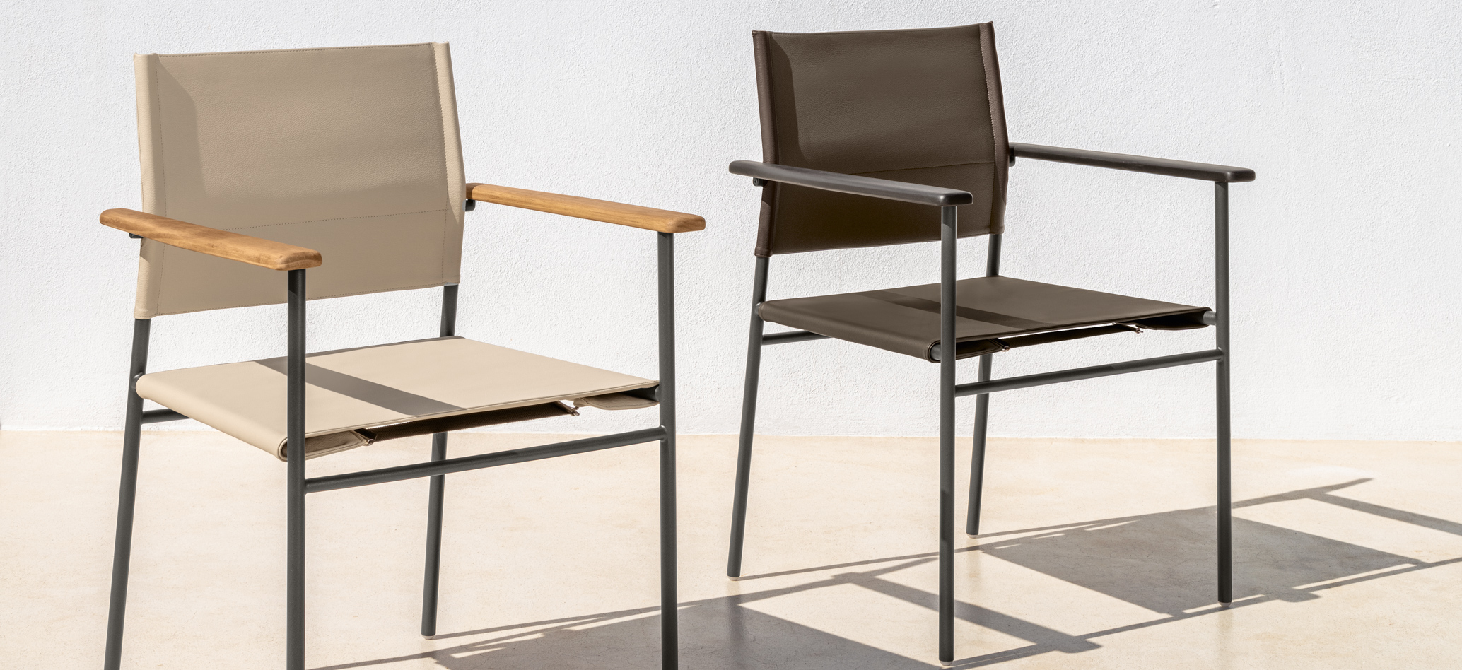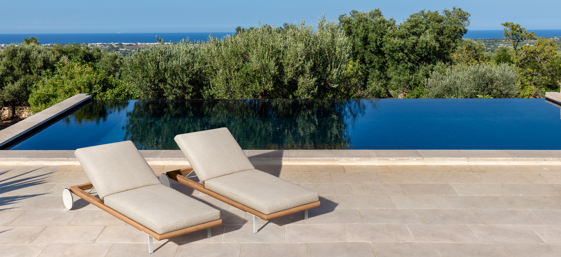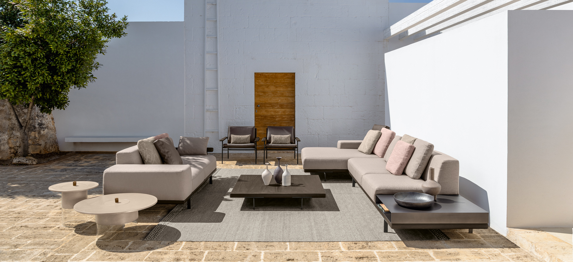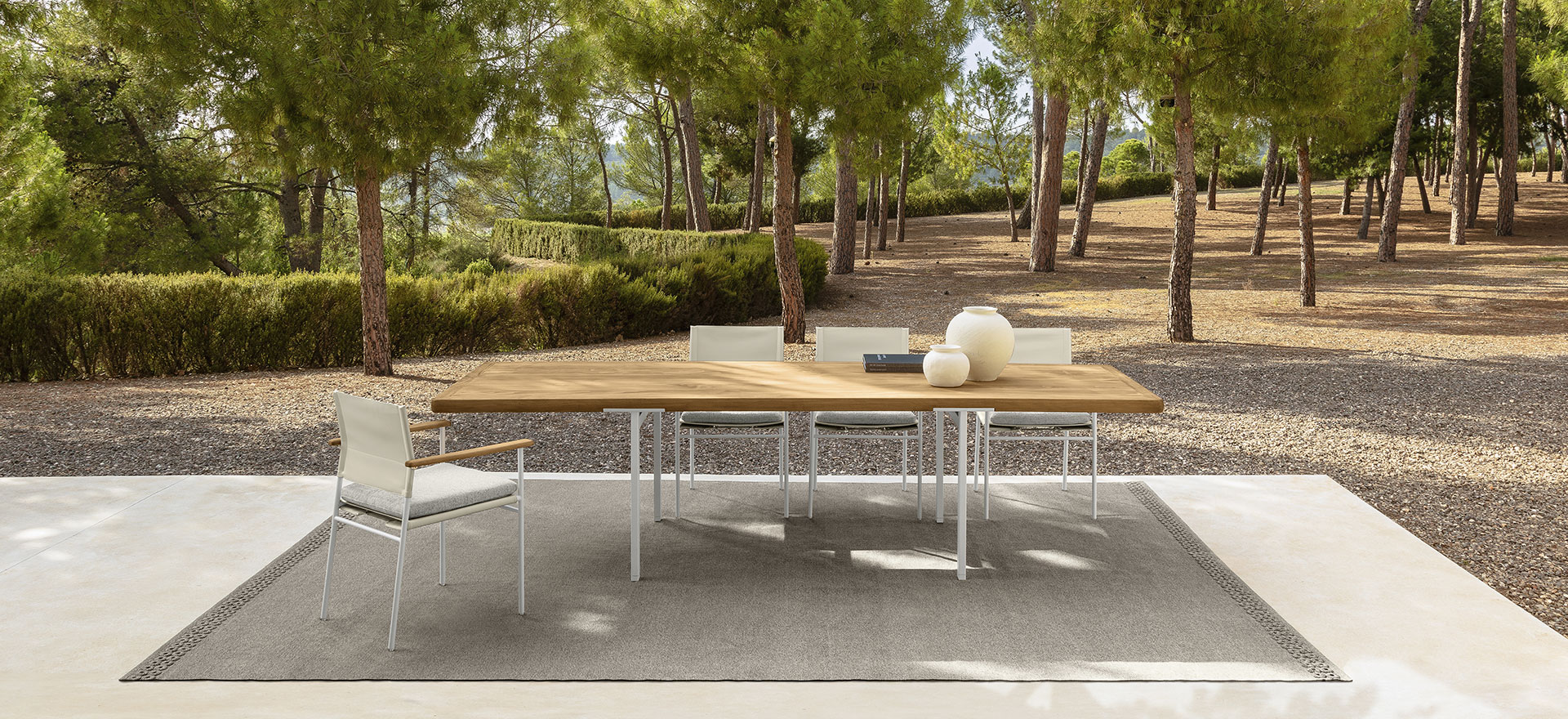 An unusual modularity that, starting from delicate aluminium feet, develops horizontally into a solid frame in Accoya wood. The geometric and linear cushions, of different sizes, are able to create different combinations and scenarios. The result is a collection with a restless soul that can give character to outdoor environments in constant change.