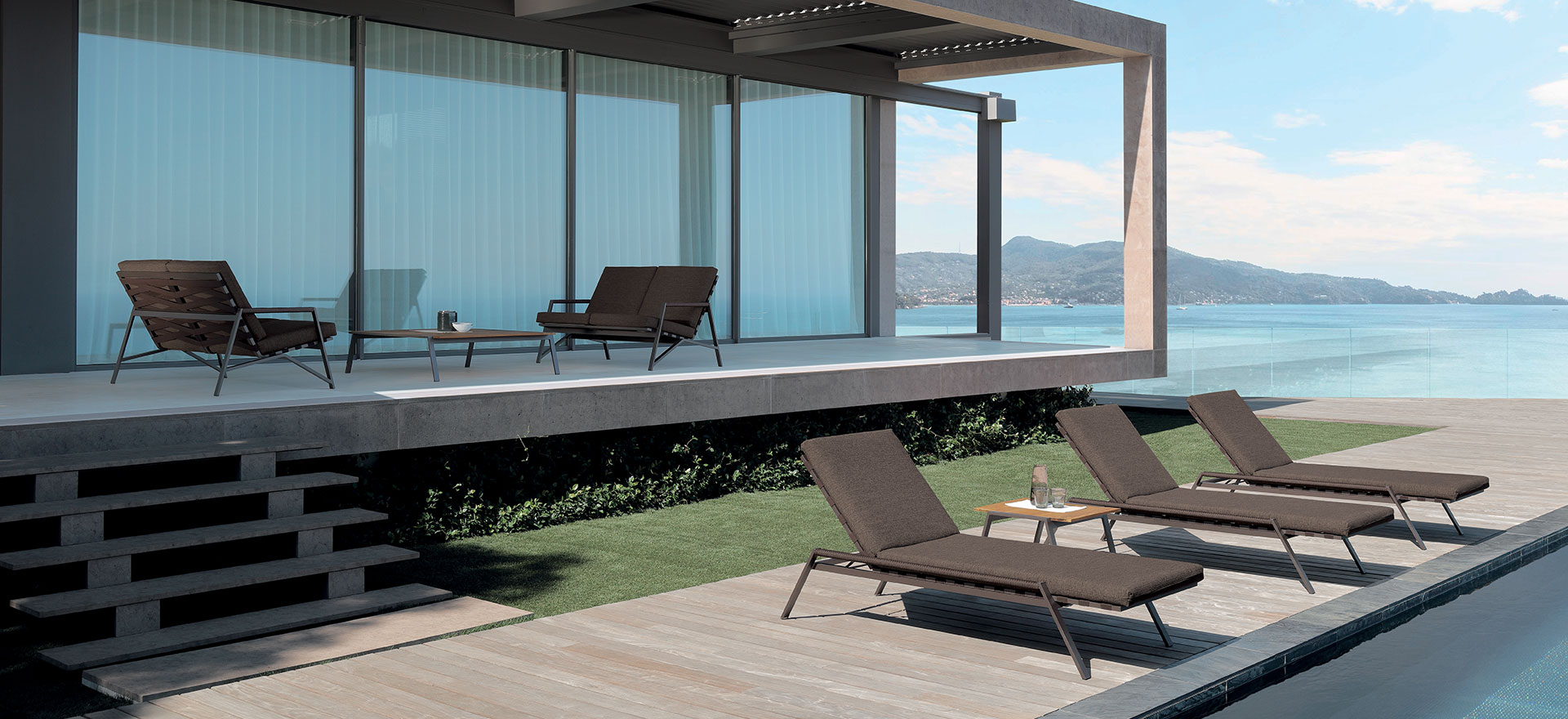The country spirit is reinterpreted searching for the formal synthesis of contemporary furniture. The result is a proposal for outdoor furniture, in which different materials such as aluminium or synthetic belts coexist harmoniously with other traditional material such as the rope.