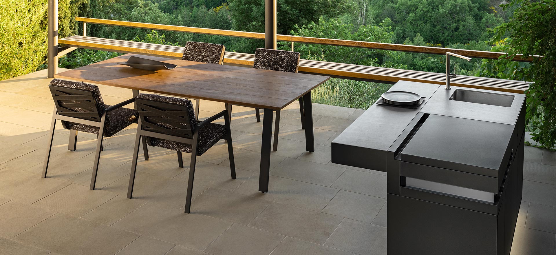 The origins of the COTTAGE collection, designed by Ramón Esteve, remind to the Far West, where wide seats and high backrests were placed in the farm’s porch and ranches.