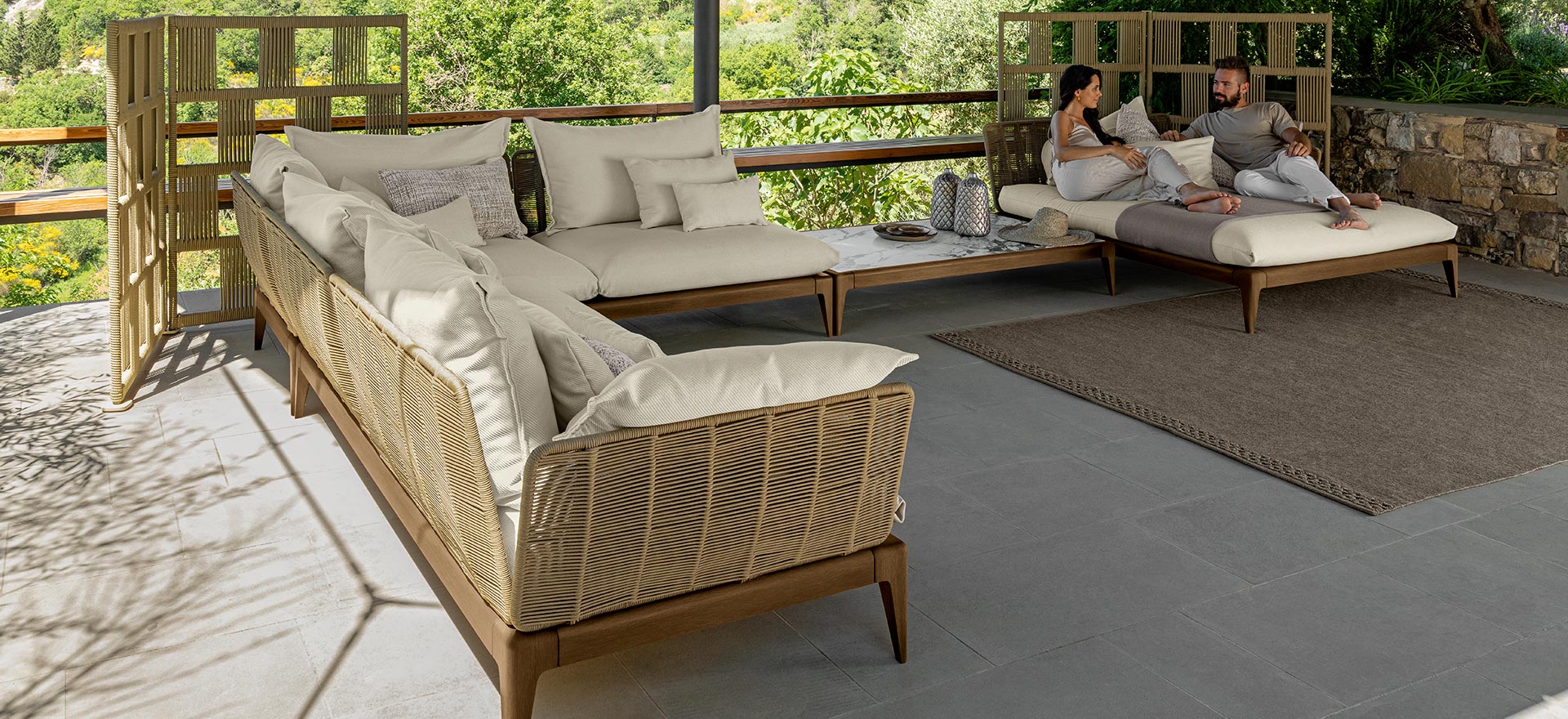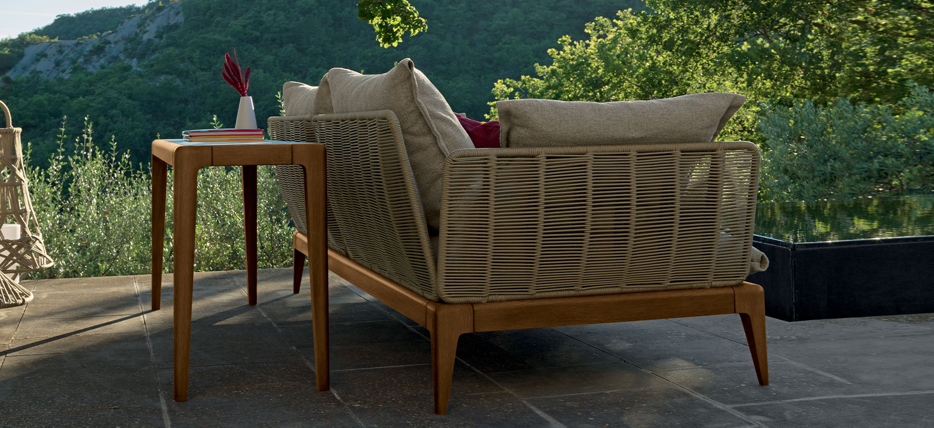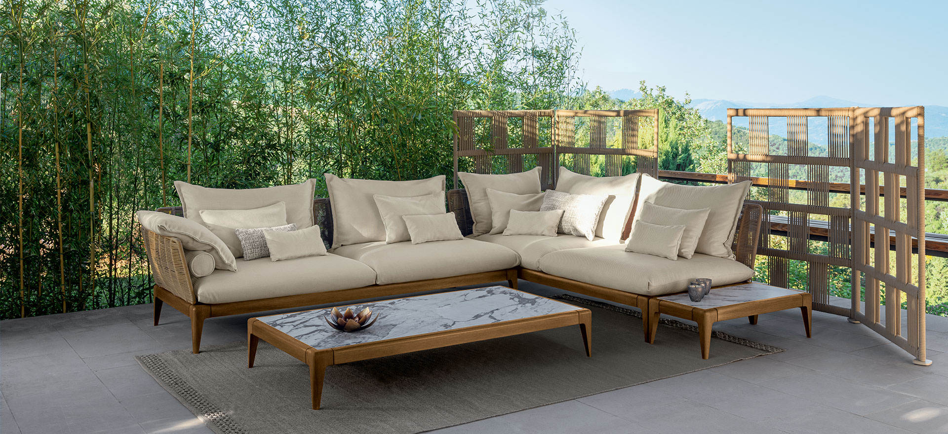 The use of fine materials, such as the wood in the base, and an accurate fabrics’ selection convey to the entire collection an elegant and sophisticated appeal. The rope plays the lead role in this collection and is intertwined with the armrests and backrests of every seating element: living armchairs, fixed and modular sofas and dining armchairs.