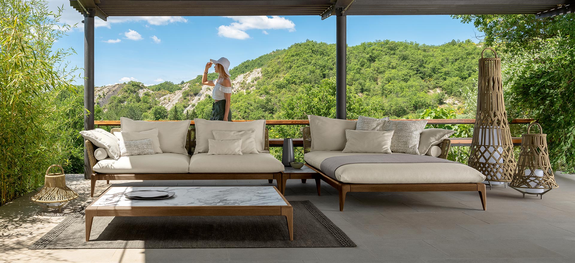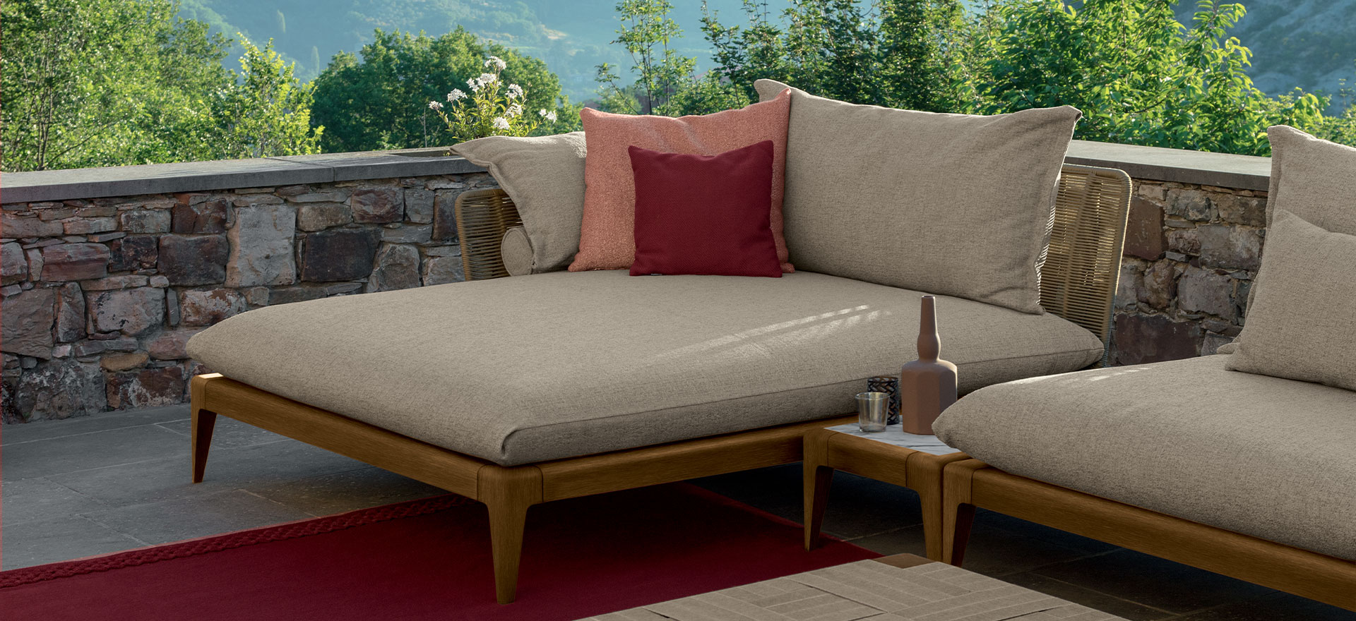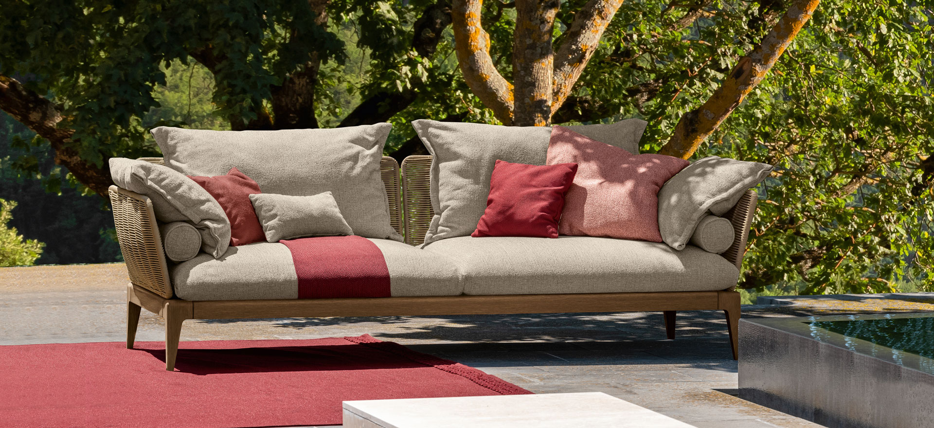 The use of fine materials, such as the wood in the base, and an accurate fabrics’ selection convey to the entire collection an elegant and sophisticated appeal. The rope plays the lead role in this collection and is intertwined with the armrests and backrests of every seating element: living armchairs, fixed and modular sofas and dining armchairs.