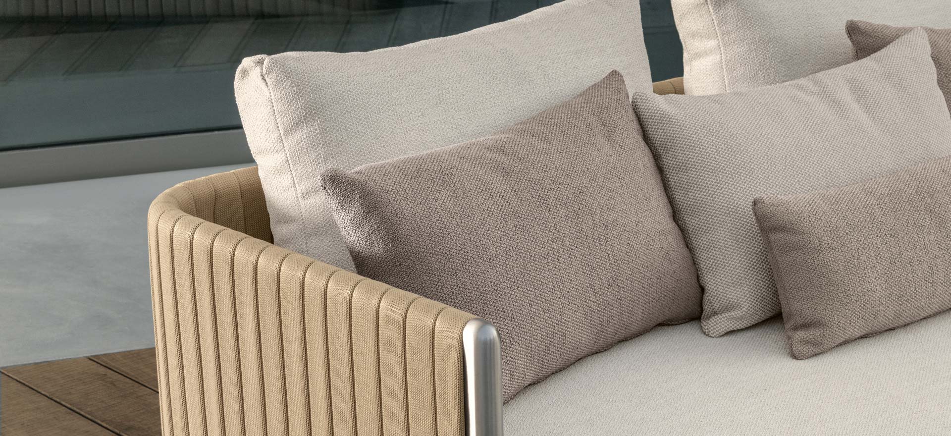 The stainless steel structure is the fil rouge of the project, totally covered with a slightly padded rope weave. An enveloping design whose materials are reminiscent of the nautical world. The visual lightness of the woven structure is counterpointed by generously padded seat and back cushions.