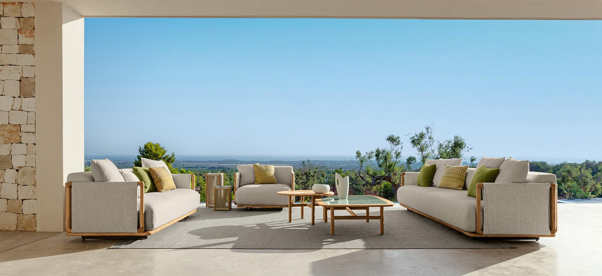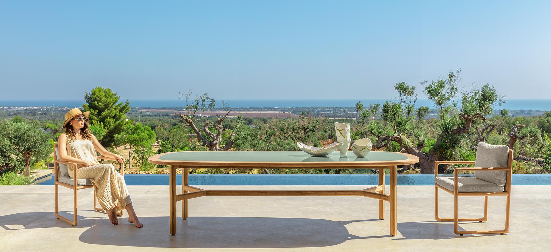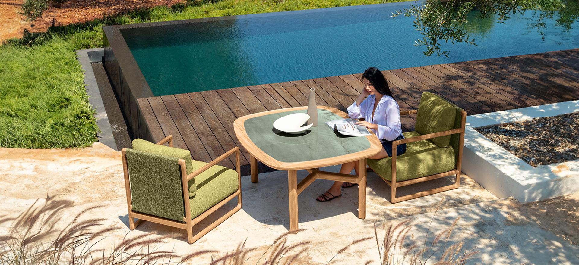 From the eclectic mind of Marco Acerbis, Jun was born, a collection that combines the elegance of teak and the generous but compact seats in full oriental style. The wooden tubular furniture and the seats communicate thanks to the tone-on-tone bouclé fabric upholstery of the backrest and armrests, which can be easily removed. The irregular shaped wooden tables are embellished with glass stoneware tops, offering a perfect balance between comfort and style, making every outdoor space an oasis of contemporary luxury.
