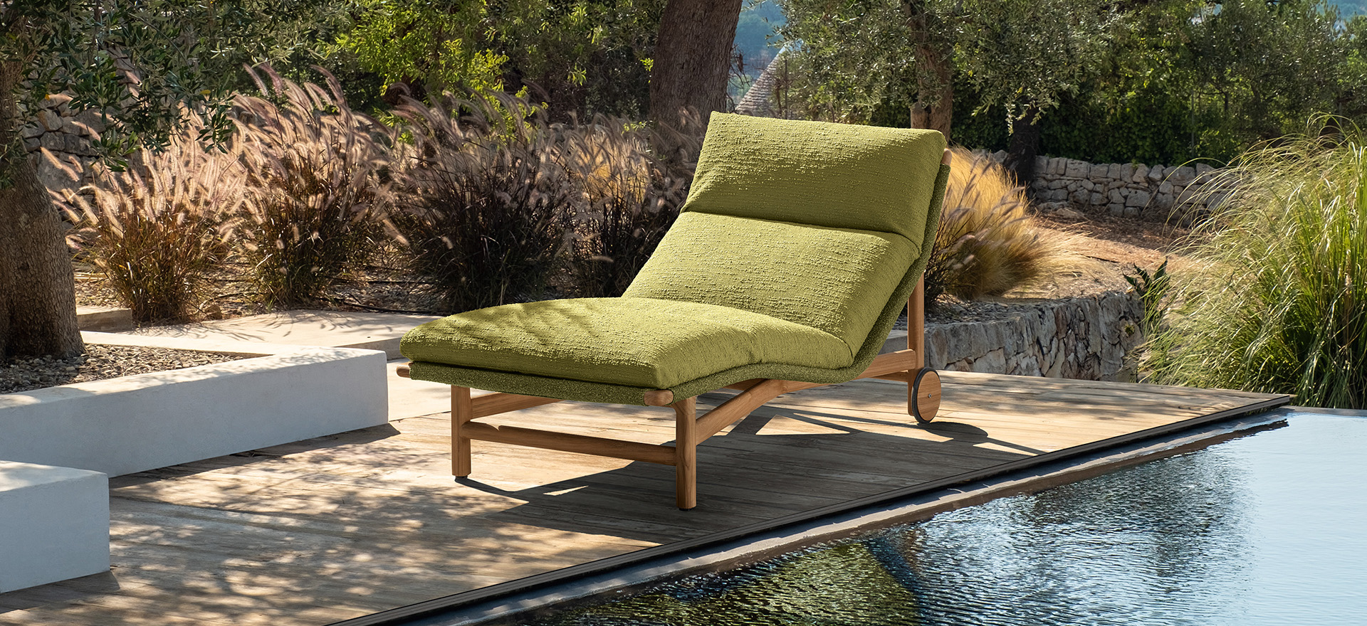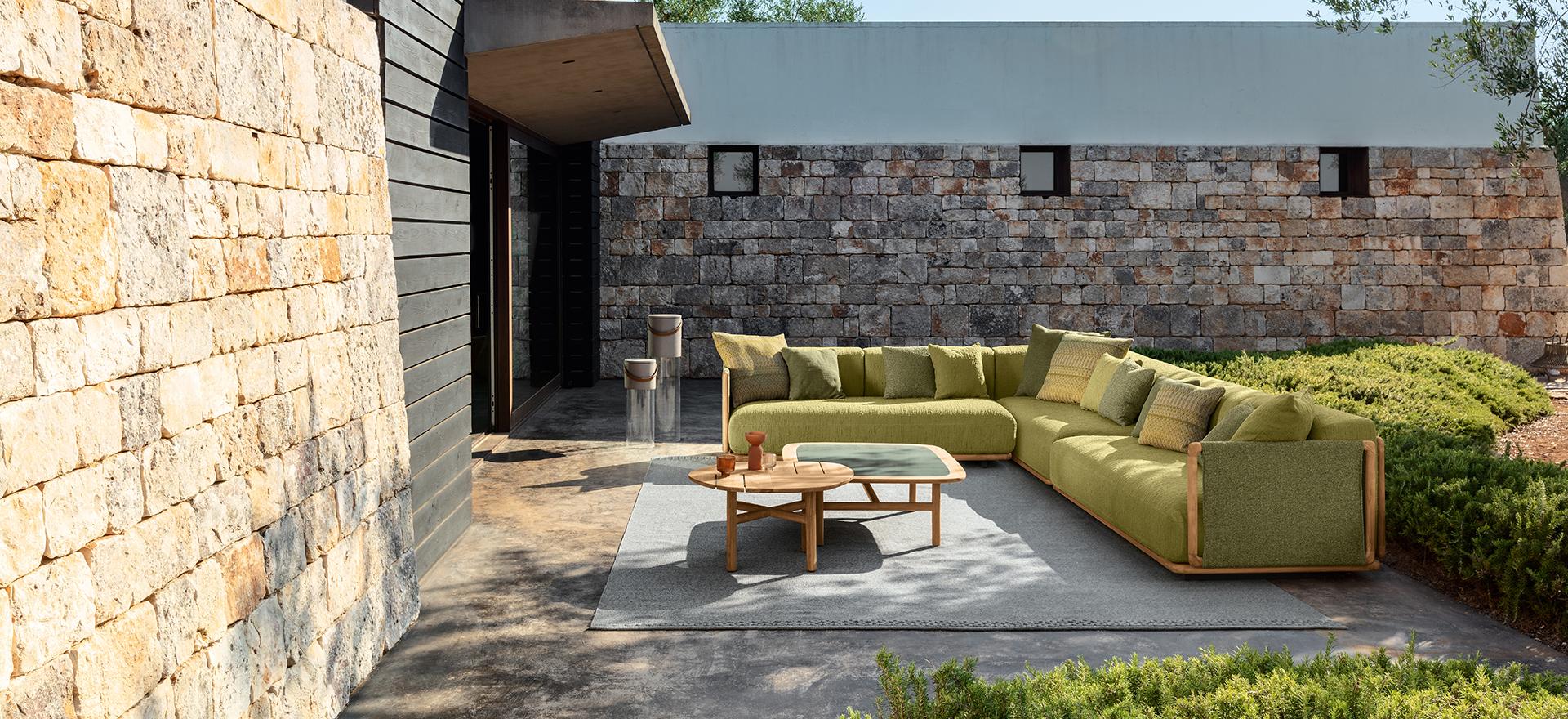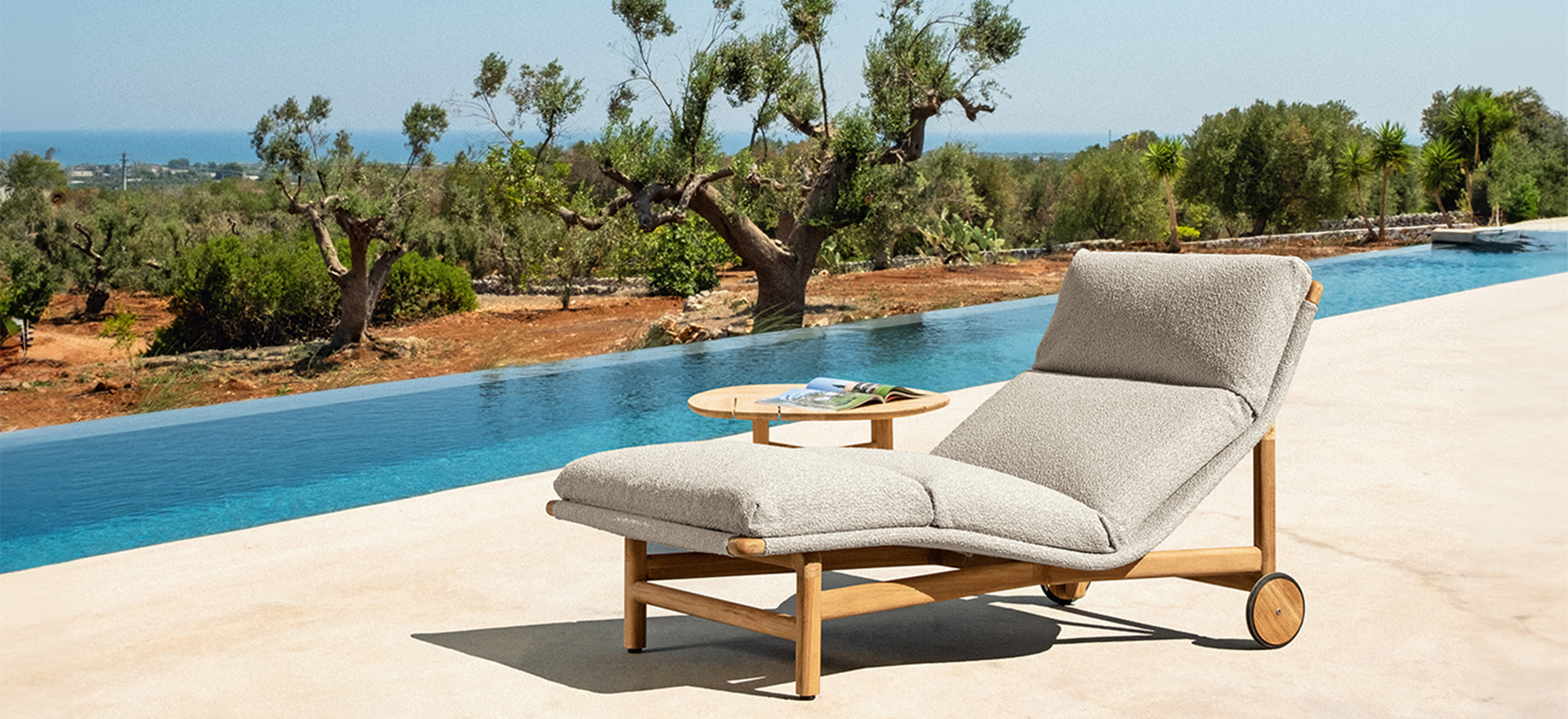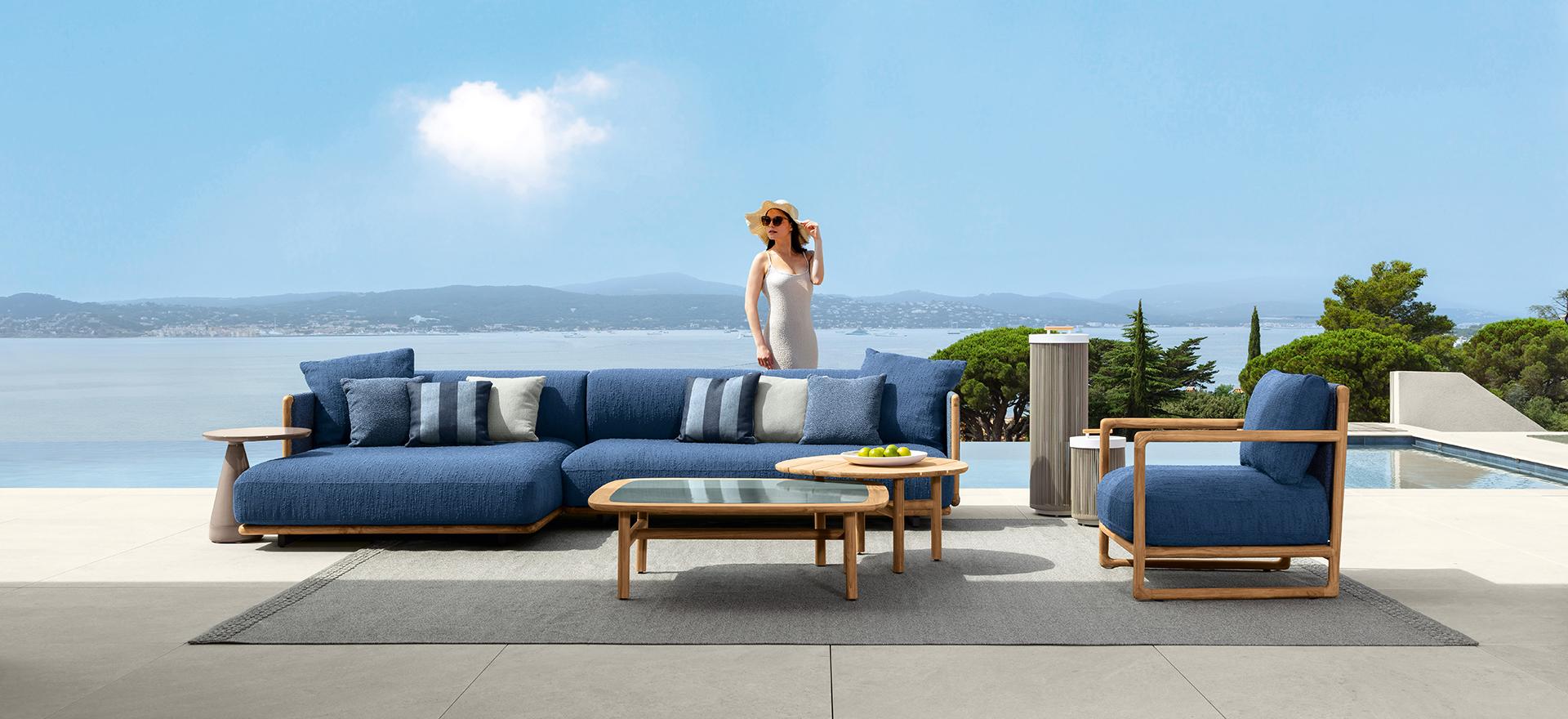 From the eclectic mind of Marco Acerbis, Jun was born, a collection that combines the elegance of teak and the generous but compact seats in full oriental style. The wooden tubular furniture and the seats communicate thanks to the tone-on-tone bouclé fabric upholstery of the backrest and armrests, which can be easily removed. The irregular shaped wooden tables are embellished with glass stoneware tops, offering a perfect balance between comfort and style, making every outdoor space an oasis of contemporary luxury.