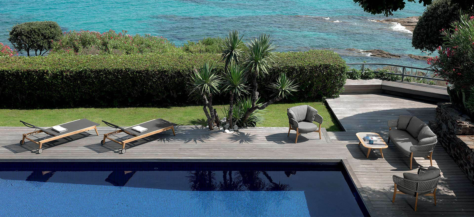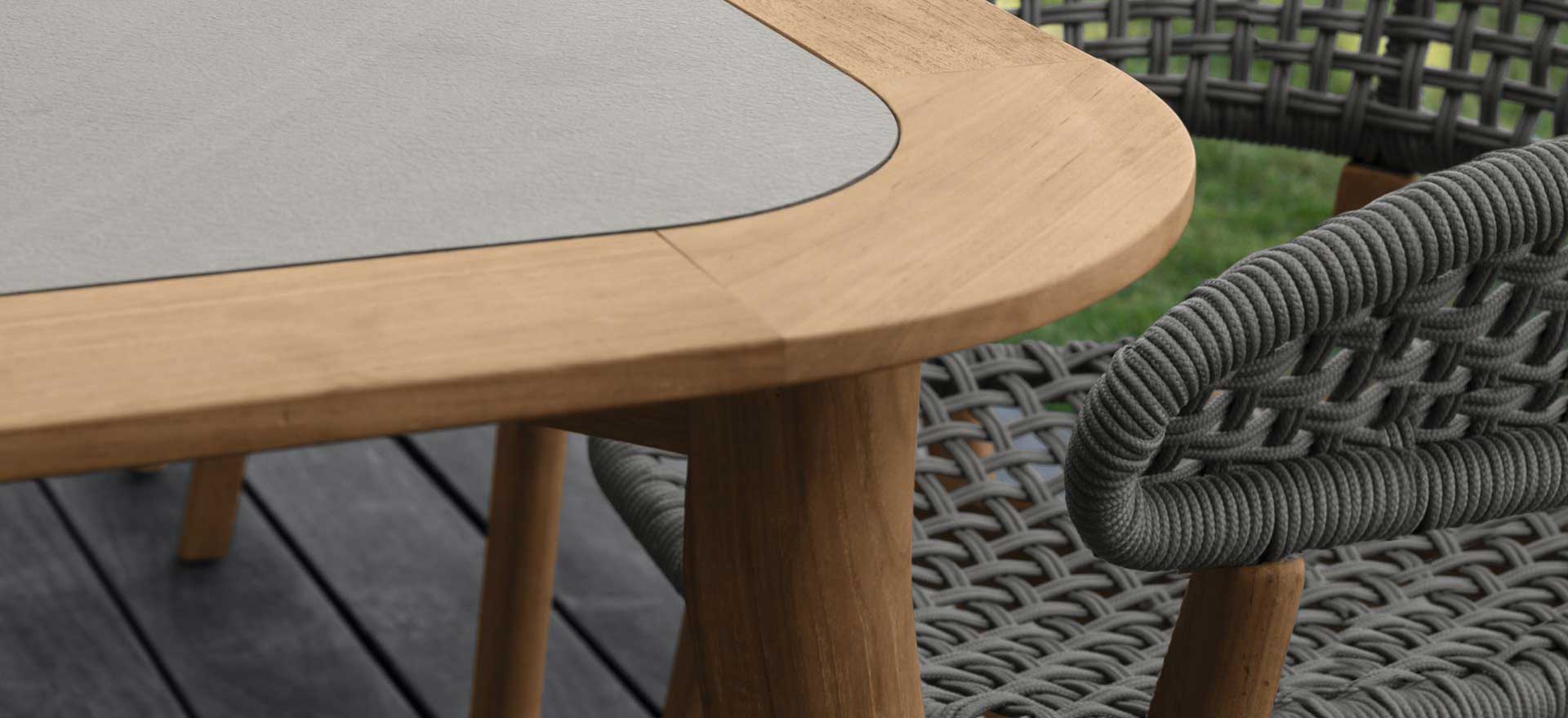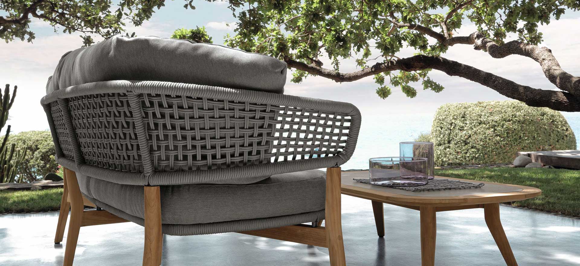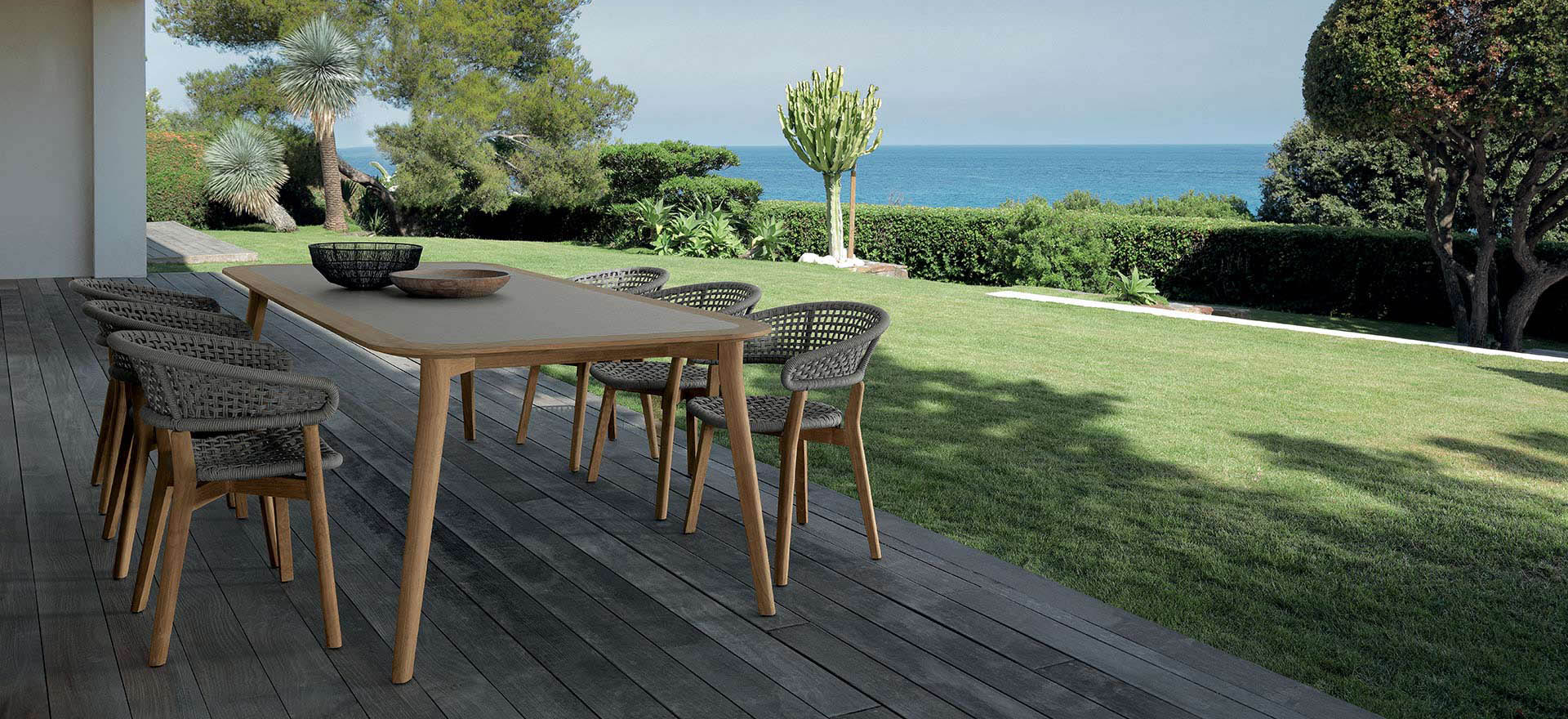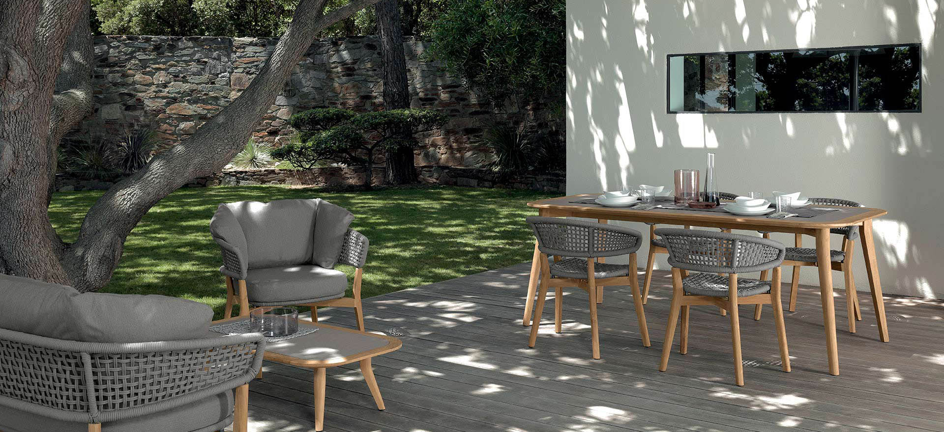 features, thanks to the warmth of wood (natural teak) and the woven rope. A collection of tables, sofas and chairs whose lines draw inspiration from the sinuous forms of the moon. A slender frame conceived to support and envelope an elegant and comfortable seating shell that makes Moon collection an indispensable furniture to live a relaxing moments creating a unique and luxury.