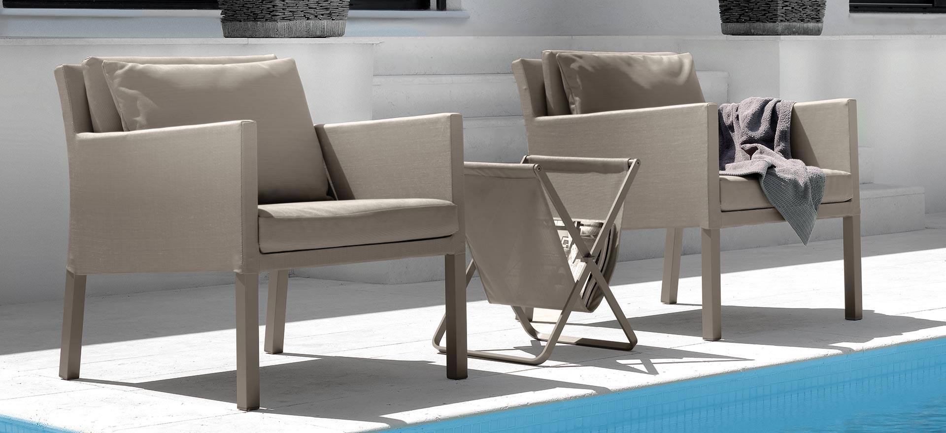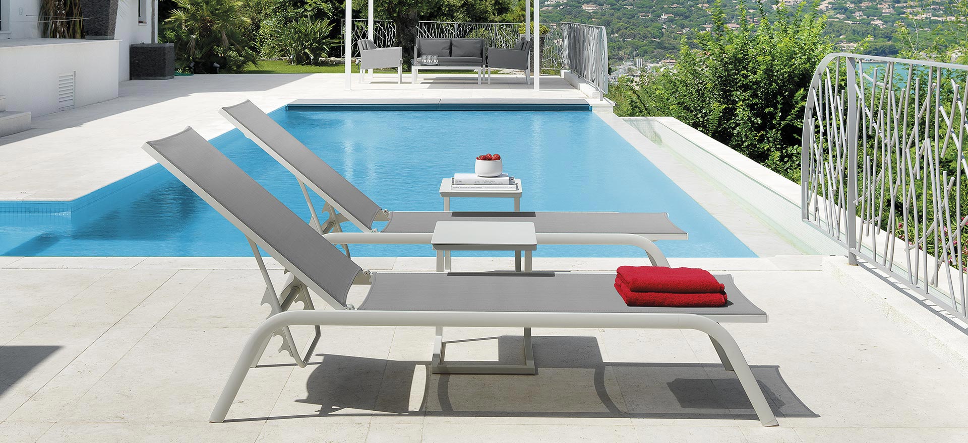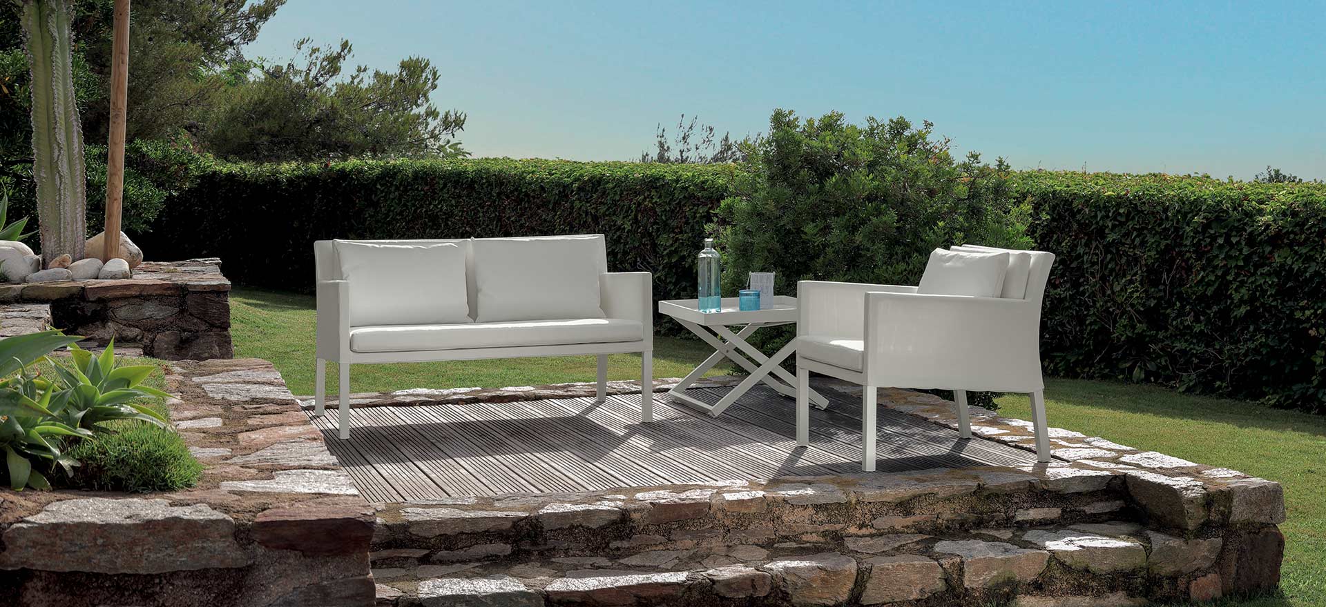 For those who have little spaces but do not want to renounce to a nice and comfortable lounge with the right character. Stackable sunbeds and removable cushions, easy to wash and weather resistant.