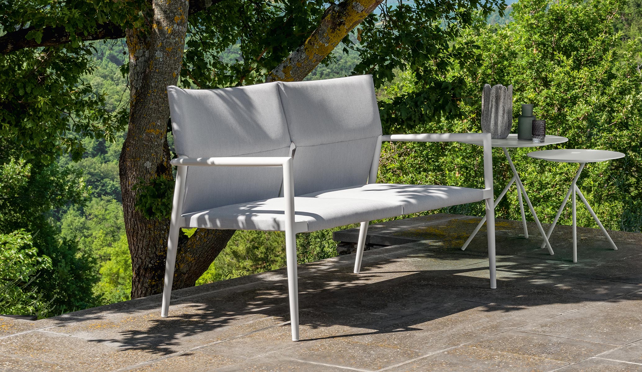 The Adam collection sofa completes an outdoor relaxation area. Thanks to the aluminum of the structure and the fabric used for the cushions, it is a perfectly weather-resistant product, as well as in perfect line with the design of the collection.