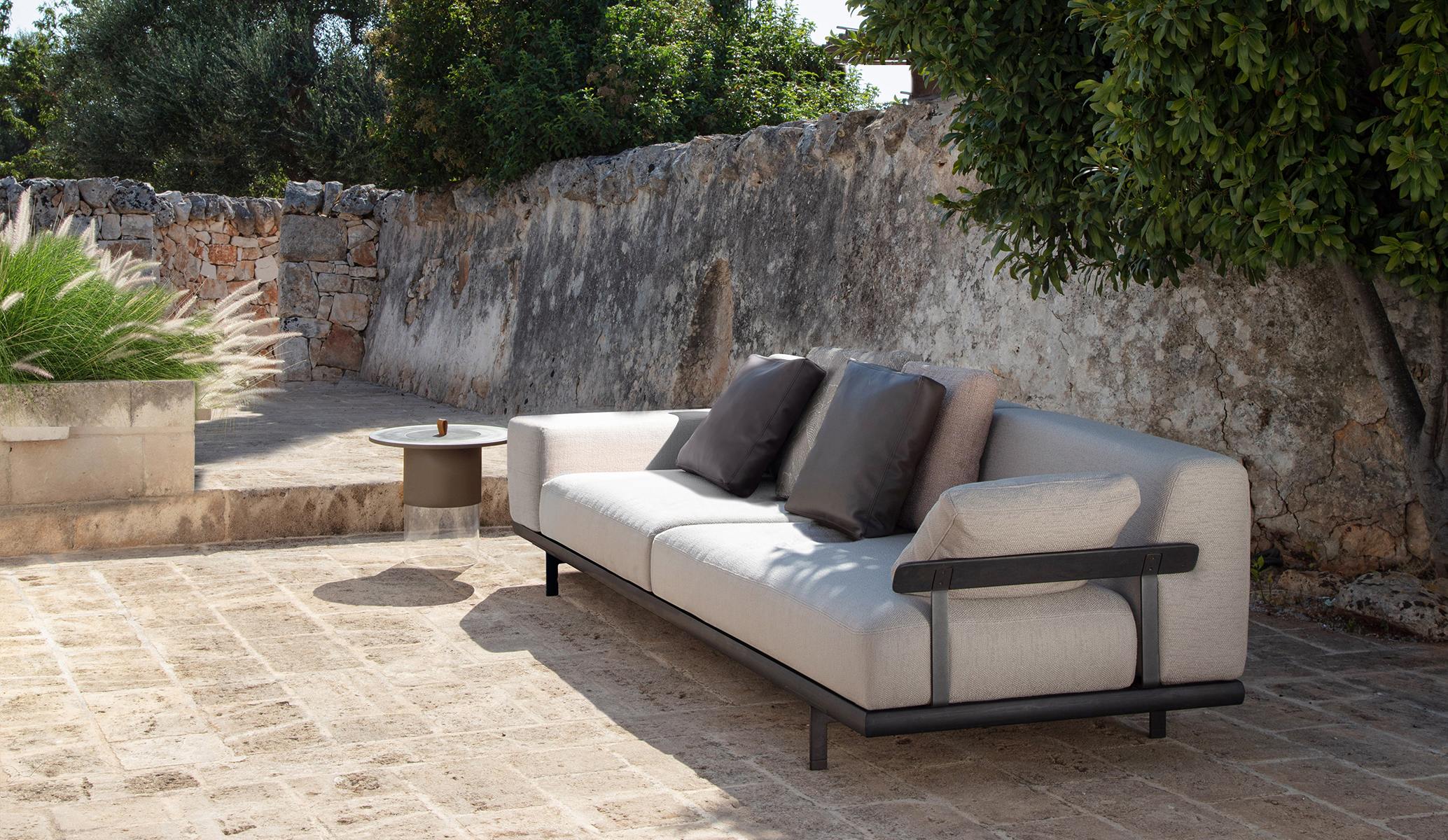 The Allure 3-seater outdoor sofa, gives character and personality to the outdoor environment in which it fits. It has two armrest variants to choose from whose combinations give birth to different styles: thick and geometric with the armrest covered in fabric, elegant and light with the armrest in wood and aluminum. The compositional harmony between these two variations influences the final style of the sofa. The rigorous shapes and soft colors of the cushions complete the design and personality of the garden.