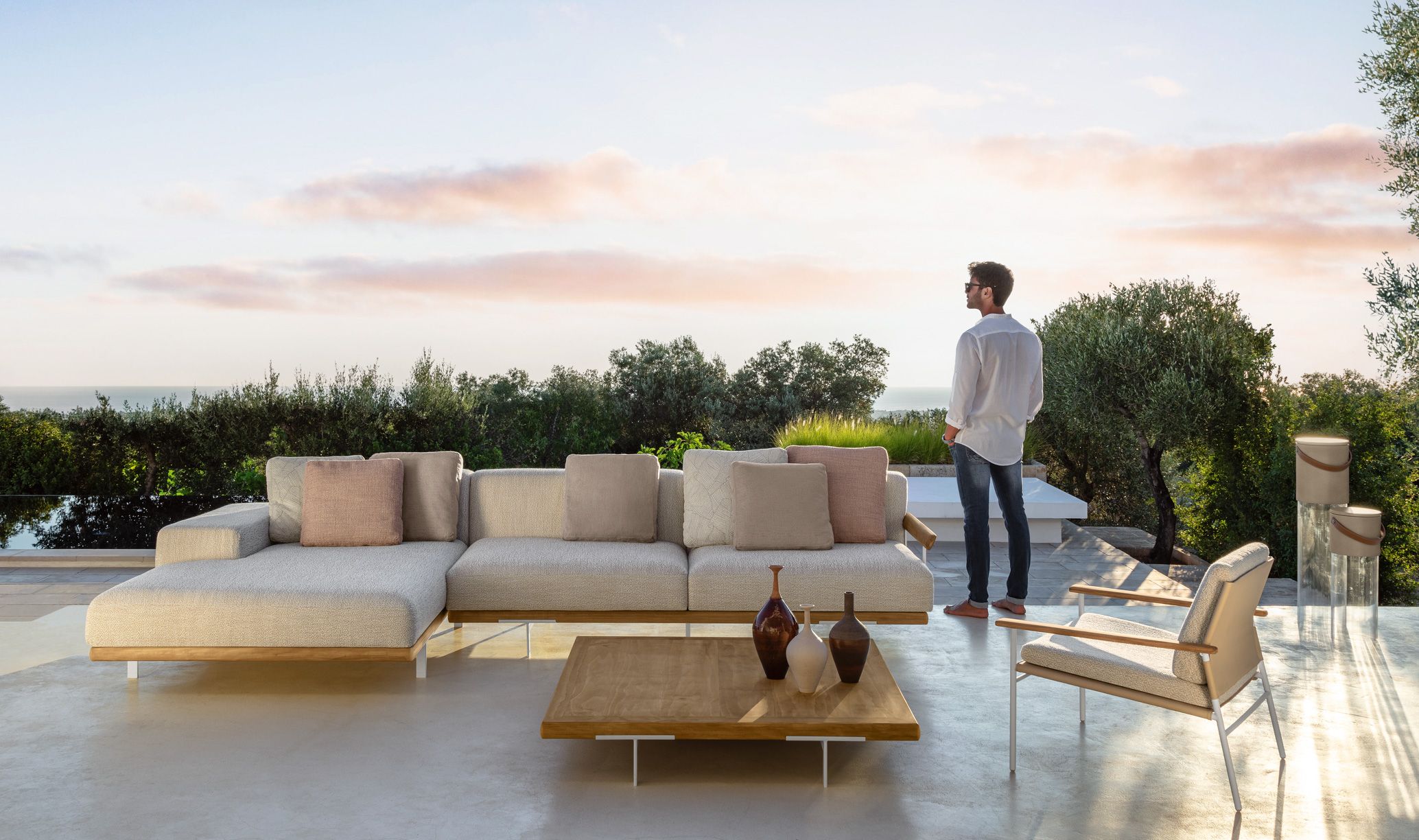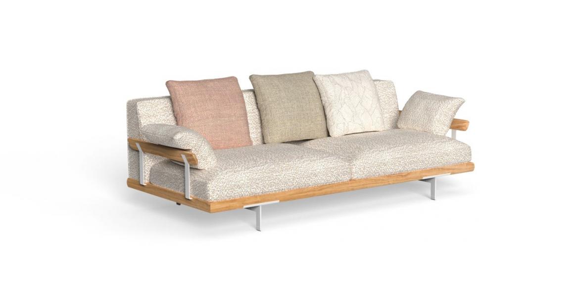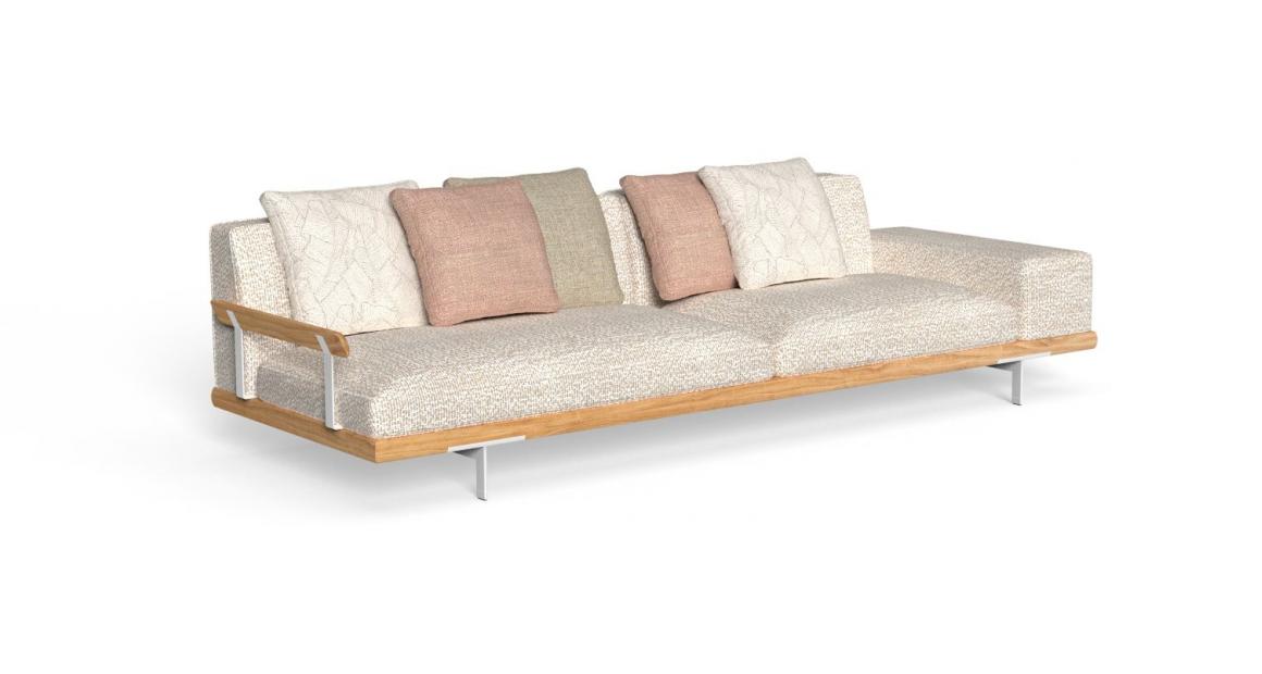 The Allure outdoor modular sofa stands out thanks to a solid wooden frame, supported by elegant aluminium feet. A contemporary sofa bound to tradition. The linear geometry of the cushions, combined with the design of the armrests, available in two versions, allow endless combinations, each with its own character and style. Thanks to its unusual modularity, design variability and resistant materials, the outdoor space appears informal yet elegant.
