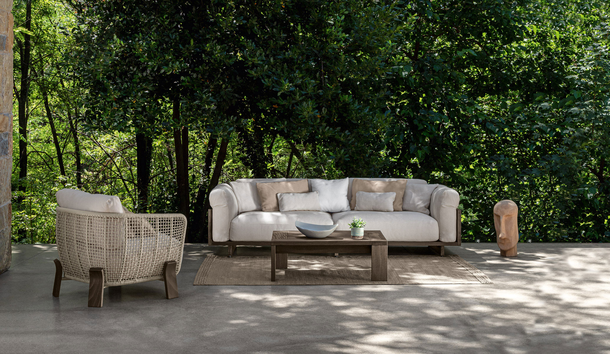 The Argo three-seater sofa recalls the theme of the wooden box, which inspires the entire collection. Characterized by big lateral waistbands that contain the cushions and make the seat welcoming and sculpted, this piece of furniture has a rigorous, geometric and refined taste. The sled base legs support the whole structure lifting up the sofa: it magically appears suspended in a play of volumes and proportions. The removable upholstery and the quick dry foam padding make this sofa the perfect item for an elegant and welcoming outdoor space.