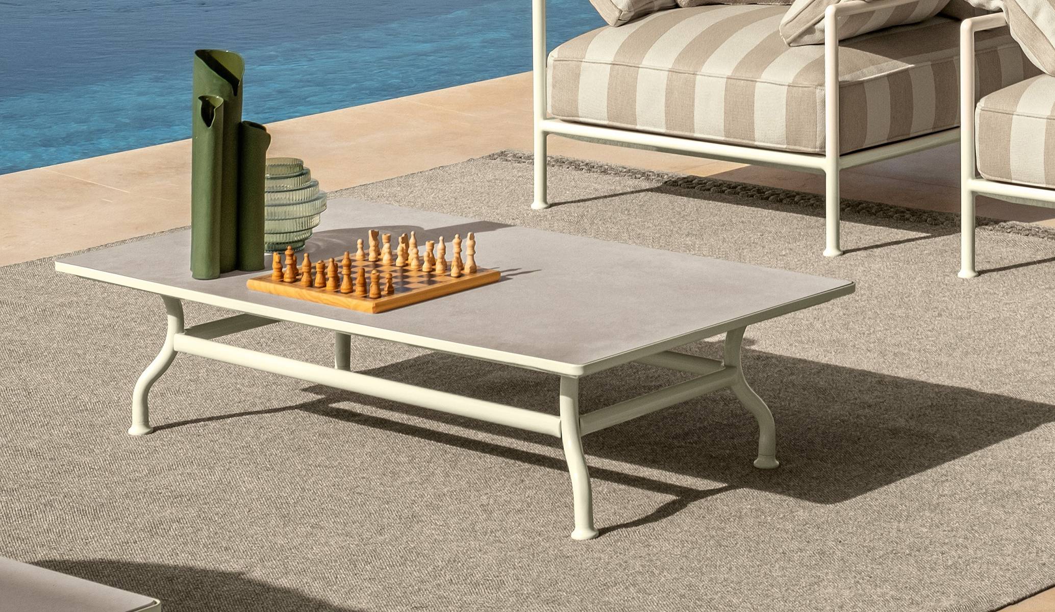 The rectangular 120×70 coffee table is the perfect accessory for a modern and functional space. The metal frame provides a contemporary touch and ensures robustness and longevity, while the light ceramic top offers a refined look. Its generous size makes it ideal for larger spaces, where it can serve as a focal point in a lounge area or living room. It is perfect for holding beverages, magazines, or decorative objects, providing a spacious and practical surface.