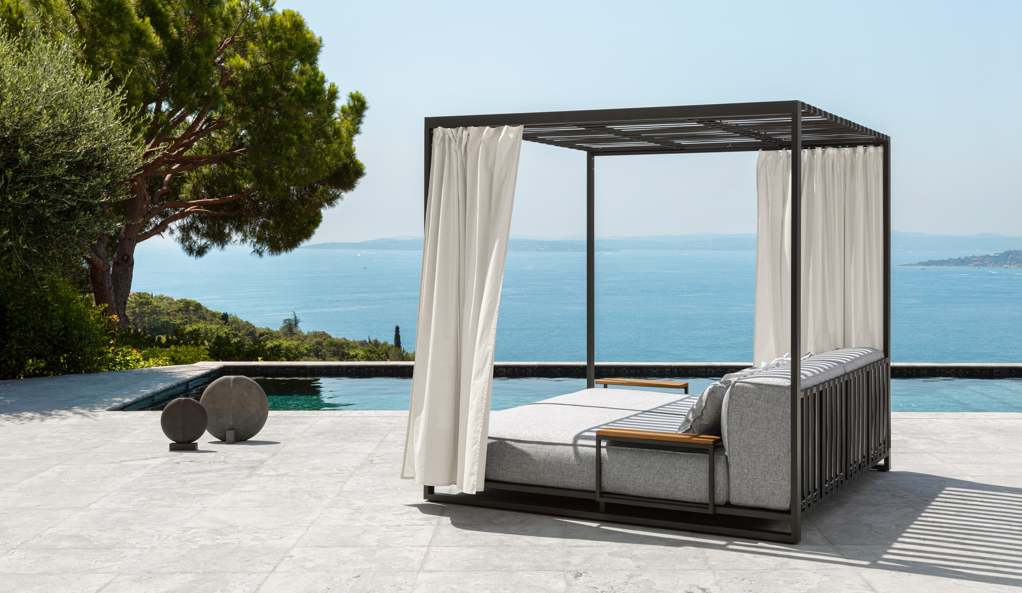 The key elements of the entire collection flow into the Casilda daybed. The powder coating stainless steel frame has a light and refined taste, in contrast to the generous volumes of the cushions: a new play of lights and lines has been created. The elastic belts used for the backrest and the canopy allow the light to filter gently and naturally, while the warm and enveloping fabrics used for the curtains, give to this product an elegant and welcoming look: it the best choice to enjoy a relaxing moment in your leisure time.
