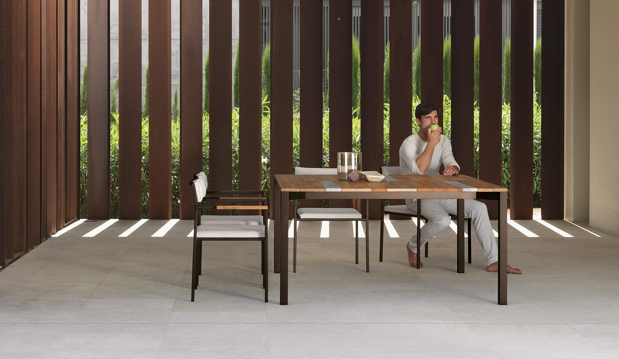The casilda dining table 260×100 with a stainless steal frame powder coated and iroko wood top is combined with marble slat according to the colour base.