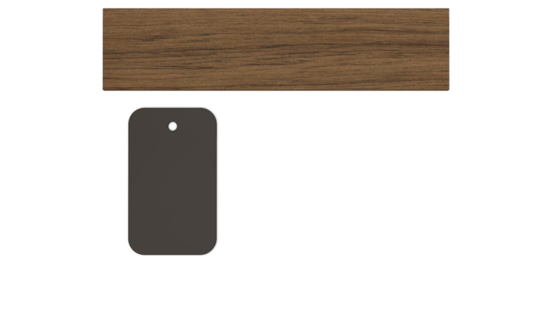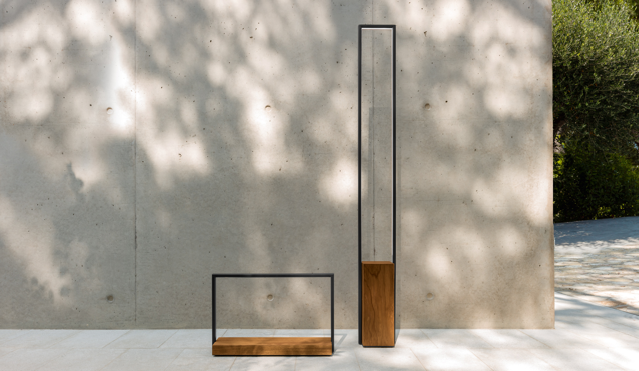 The geometric stainless steal frame powder coated match a solid iroko wood base.