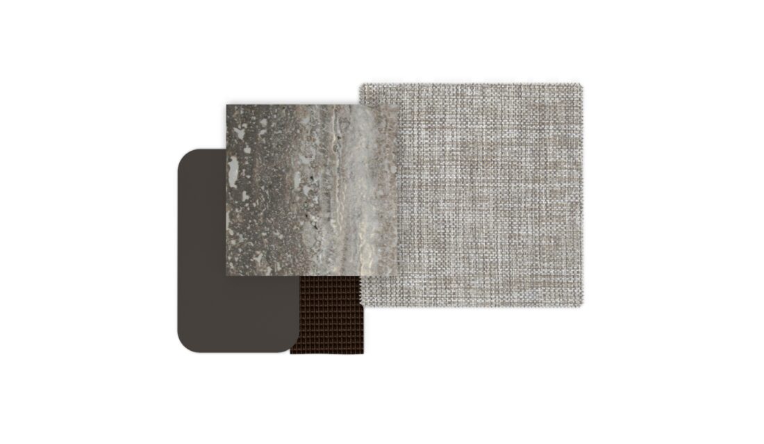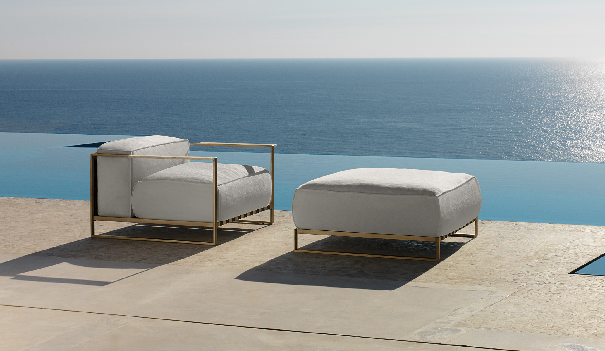 As per the other living elements, the pouf is designed with an elegant game of contrast between a rigid and geometric frame and soft and light cushions.
