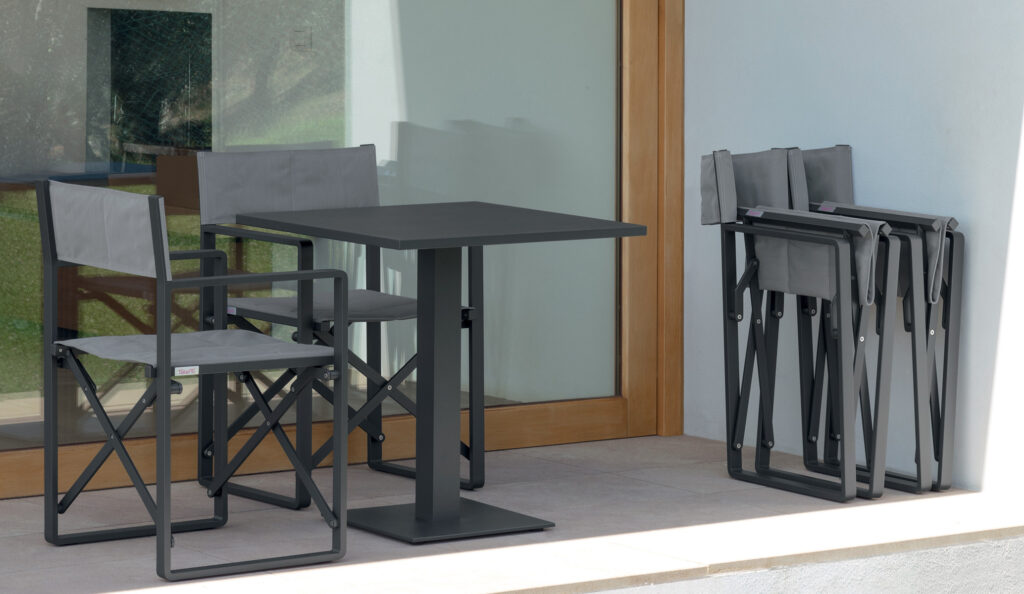 The director chair, available in white and dove-grey version, is stable and comfortable.