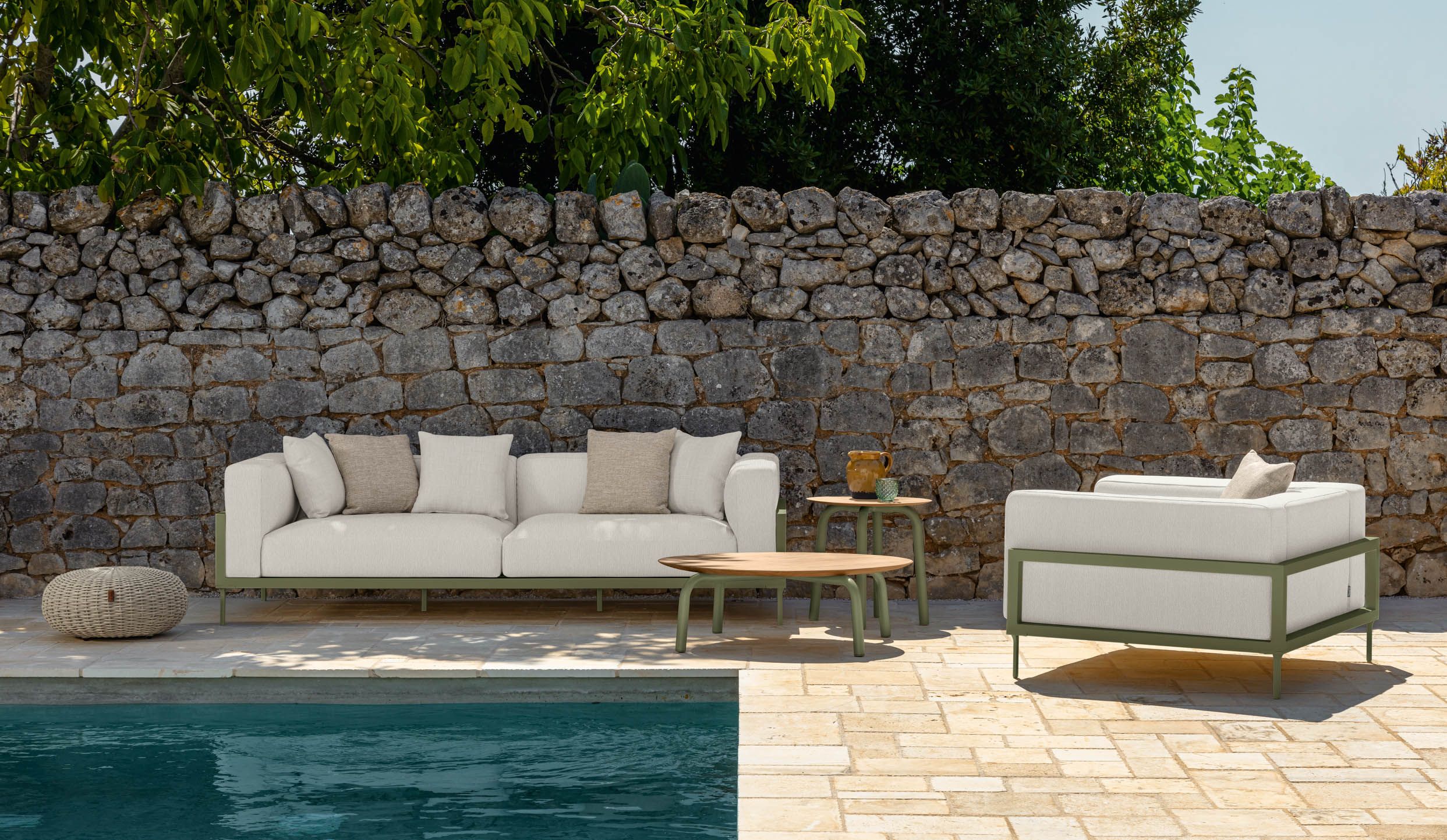 The CleoSoft Alu modular outdoor sofa is part of the collection designed by Marco Acerbis in which rigid and geometric aluminium structures support the embracing and important seats, creating a perfect balance between form and volume. The modular sofa consists of 2 square elements and a pouf that allow numerous combinations to achieve the perfect shape for your space: a module with double backrest that can perform the function of the right, left or corner module; a module with a single backrest with which to compose the desired lengths and a pouf element with which you can create longue sofas. The cushions are in fabric, removable, easy to wash and weather resistant. Quick dry foam padding.