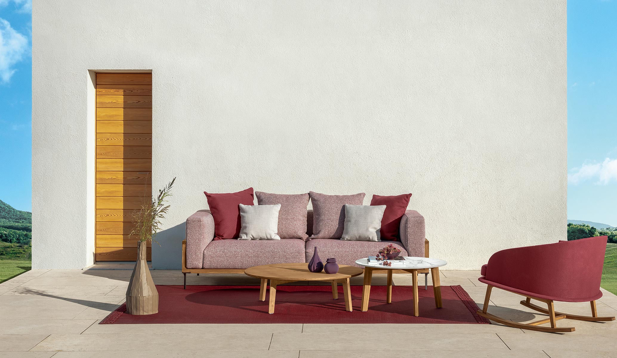 The design of the CleoSoft Wood collection offsets the rigid wooden frame of the 3-seater outdoor sofa with the softer lines of the other modules. The voluminous upholstery of the seat and backrest, made of removable, easy-to-wash and weather-resistant fabric, rests on the sturdy wooden frame, hallmark of the entire collection. The padding is made of quick dry foam.