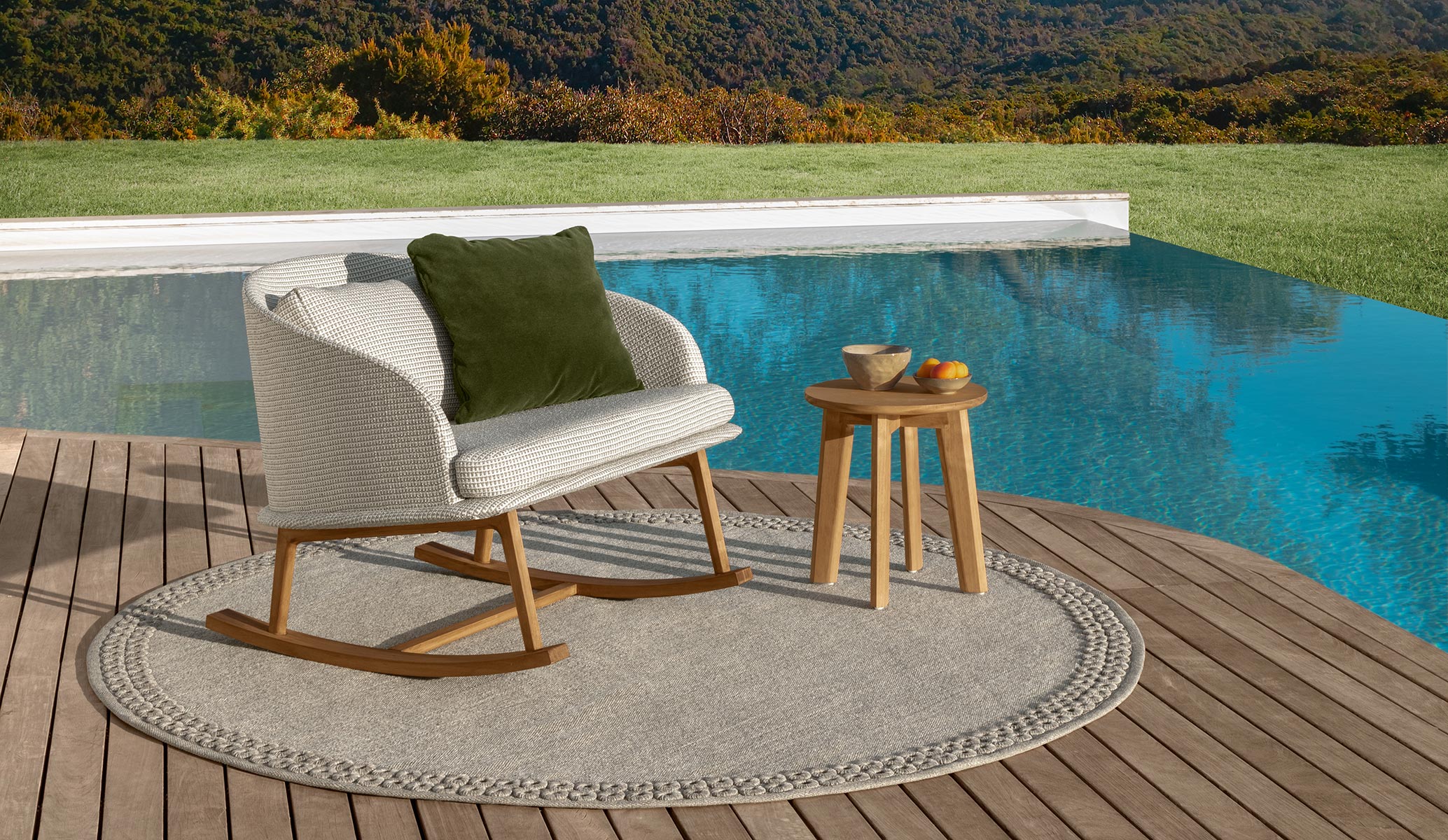 The CleoSoft Wood rocking chair stands out for its great elegance and softness, key elements of the entire collection. This piece of furniture has been designed by Marco Acerbis to be combined with the geometric modules of the same line, aiming to reach a perfect balance between shapes and volumes. The structure is in wood and the cushions, padded in quick dry foam, have removable covers, are easy to wash and resistant to atmospheric agents.