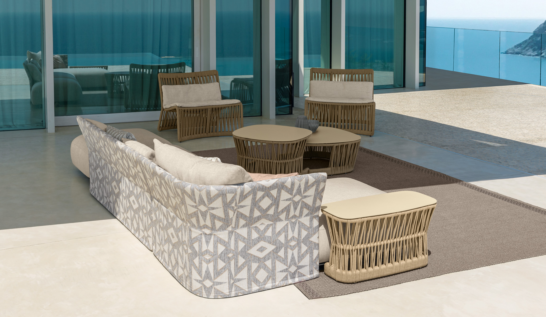The braiding is interrupted in order to allow the joint between tables of different sizes or even the sofa seats. The tables become real side tables to be positioned according to personal tastes.