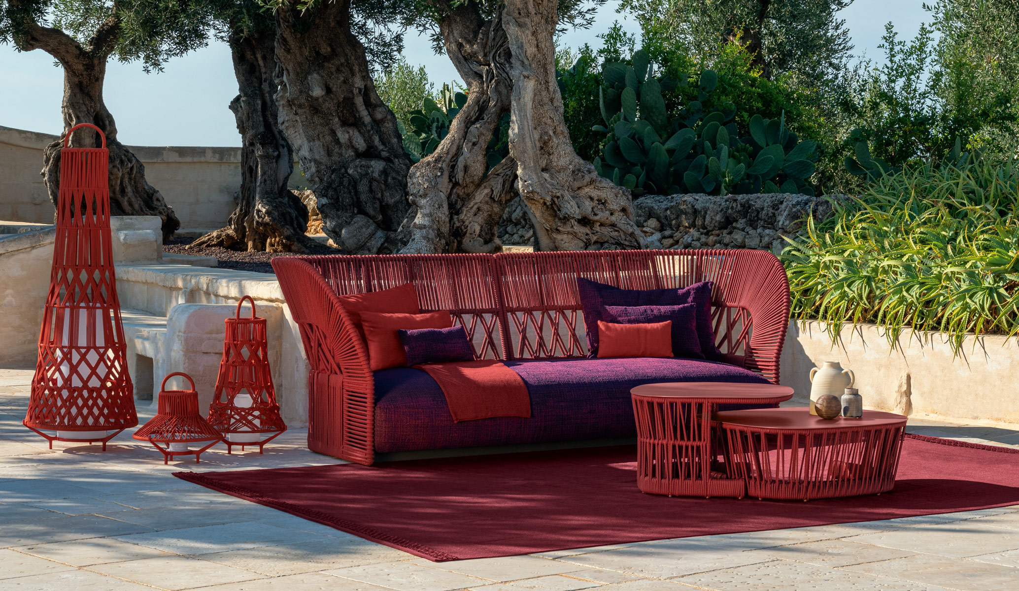 The Cliff Decò sofa is large and elegant. Its backrest, realized in nautical synthetic rope, matches the cushion fabric, creating a pleasant contrast. The aluminum frame guarantees solidity to the product.