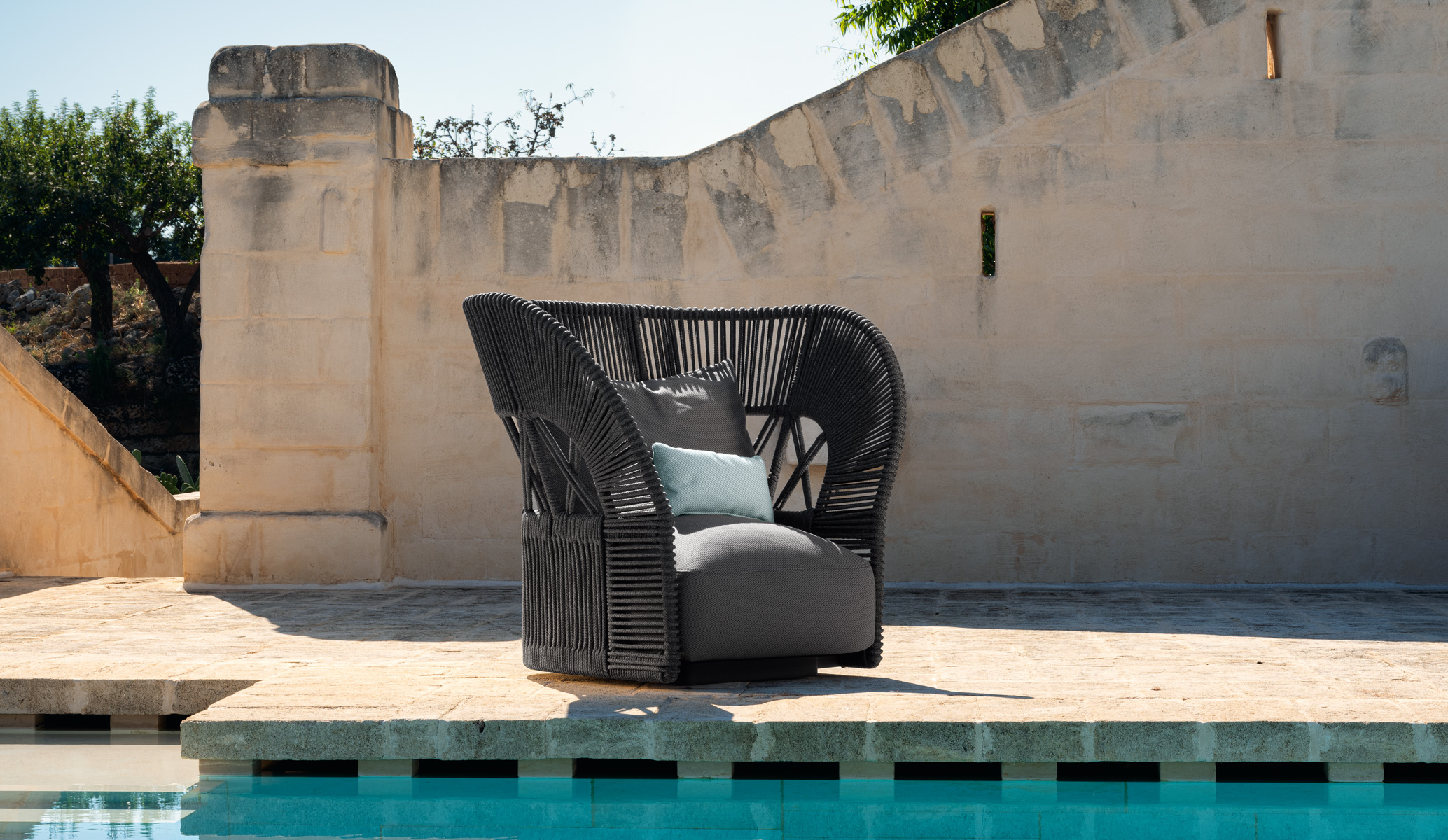 The Cliff Decò lounge armchair, soft and embracing, is impressive to the eye. The large backrest, whose aluminum frame is covered with synthetic nautical rope, creates plays of light as a result of the geometrical shapes of the braided rope. Perfect to decorate your outdoor area thanks to the used materials, it is characterised by quick dry foam padding and weather resistant upholstery.