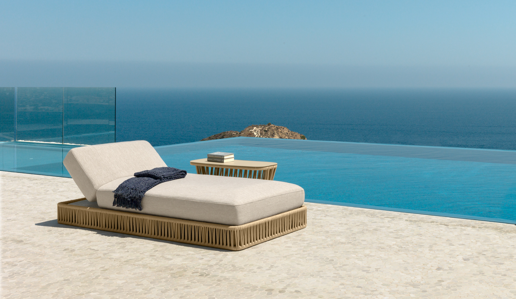 The tubular structure covered with braided hawsers makes the sunbed the characterized element of the entire collection. The soft cushions recall the shape of the sofa seats designing an ideal style braiding.