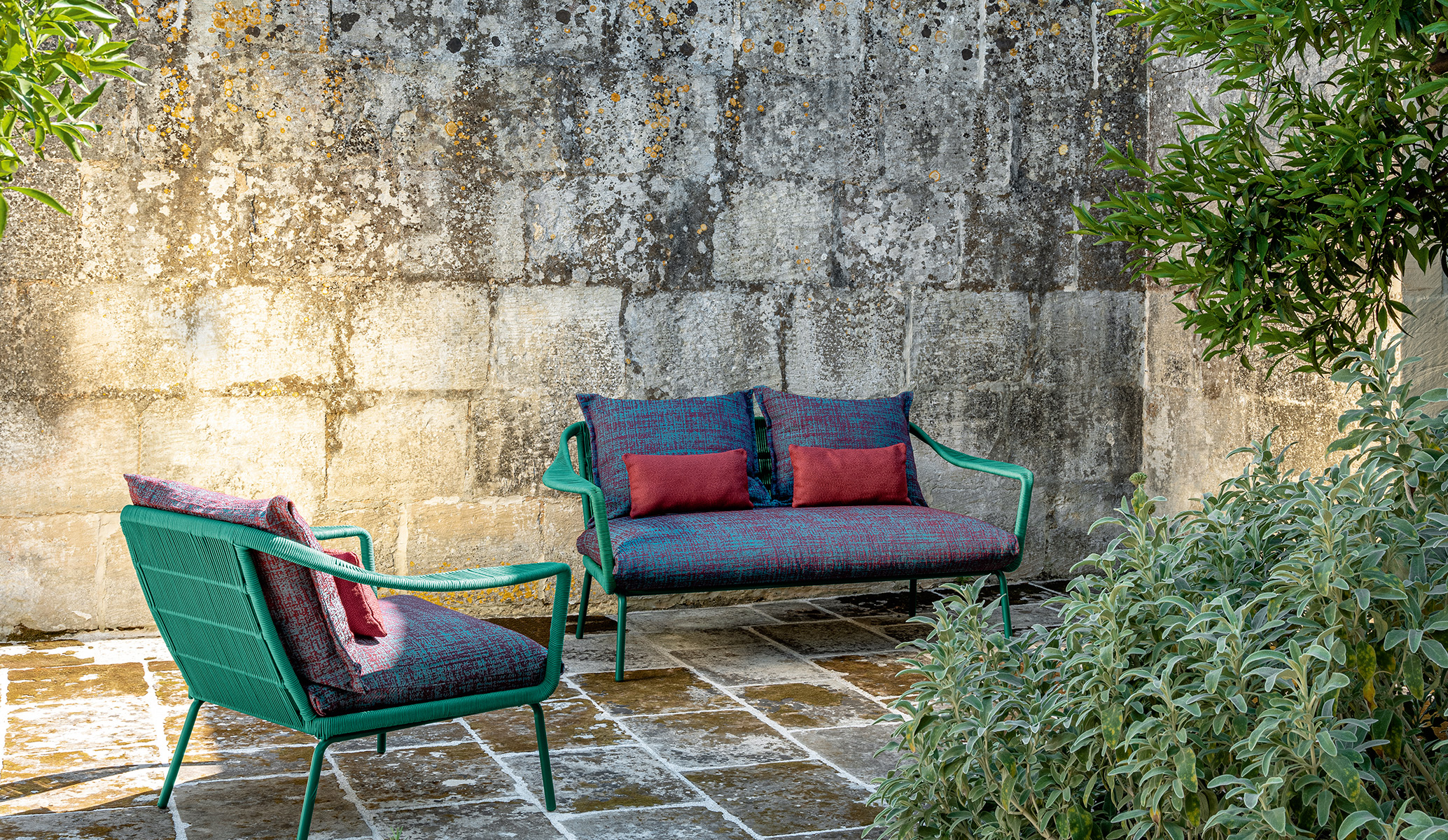 With its soft and wraparound shapes, the Love Seat Sofa of the Cruise Alu Collection is perfect for a moment of relax. The solidity of the structure is assured by die-cast aluminium which ensures the unmistakable style of the collection. The cushions, realized in quick dry foam, match the fabric, water conditions resistant, and the synthetic ropes that wraparound the backrest and the armrests.