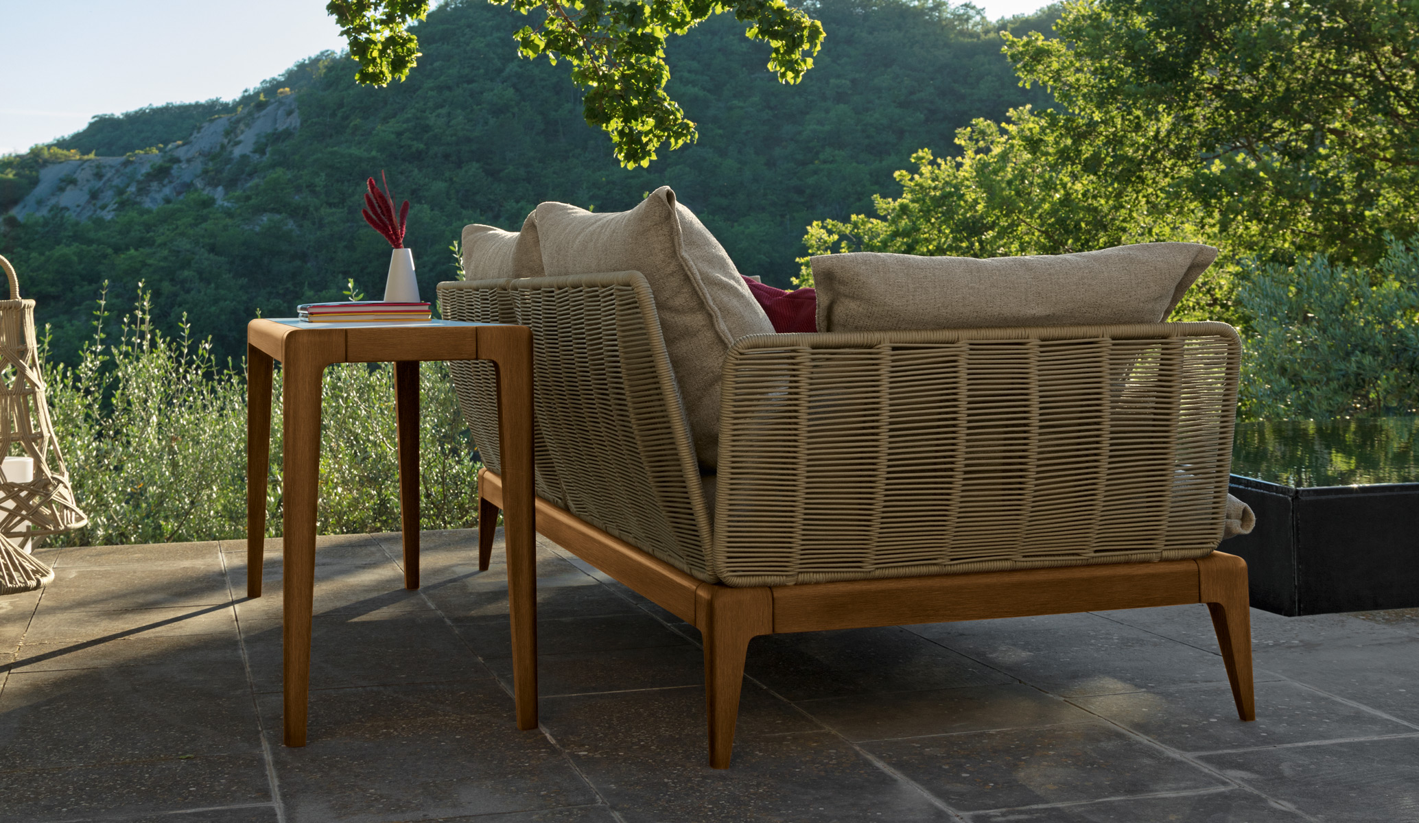 The 160×40 Consolle of the Cruise Teak Collection is ideal for completing outdoor furniture. Thanks to its small size it is not bulky. The high, functional gres top is supported by a solid wood structure, in line with the entire collection.