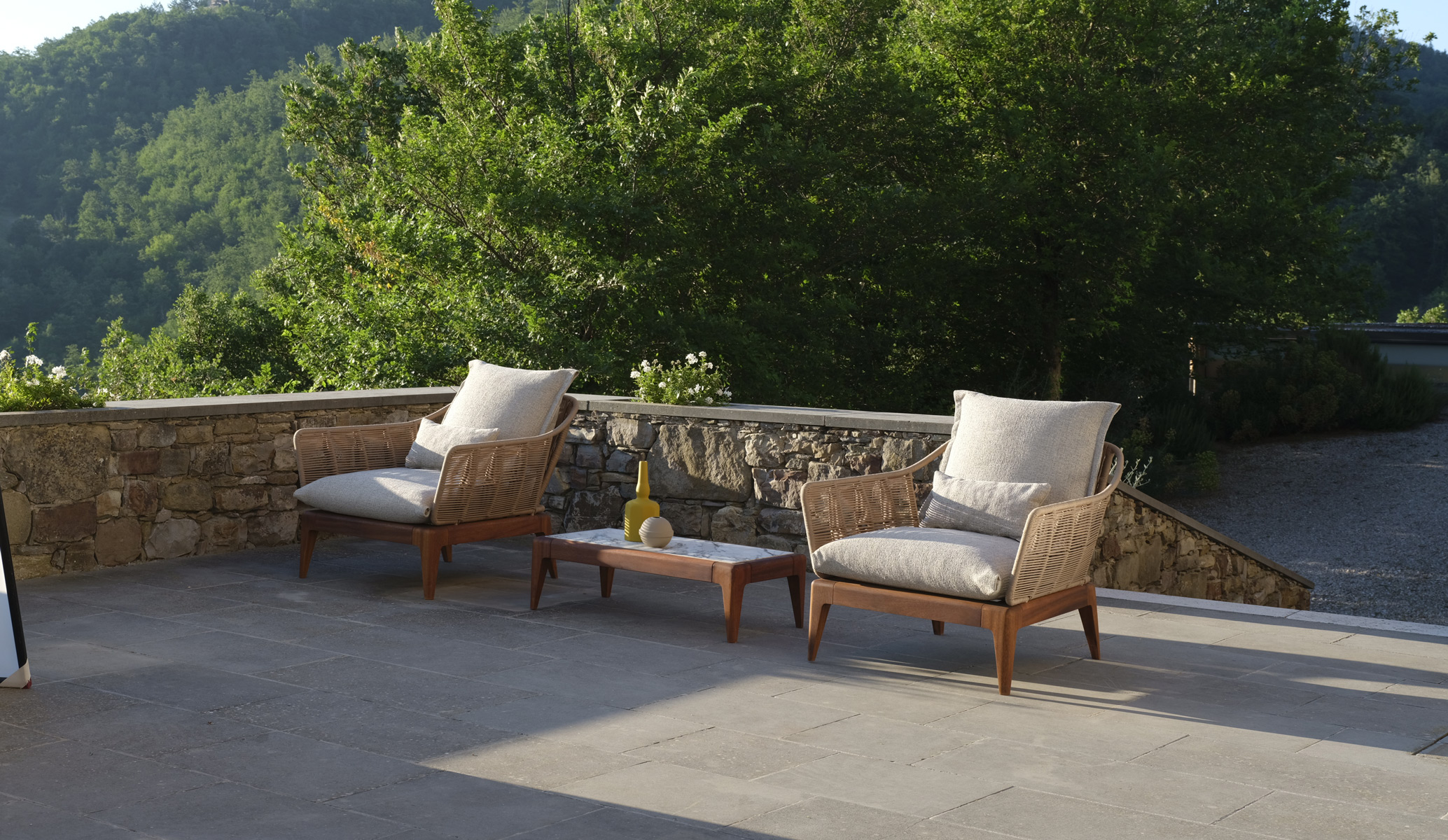 The Living Armachair’s wide and comfortable seat of the Cruise Teak Collection is made fully functional by the cushions’fabric. Removable, washable and weather resistant, the fabric, such as the ropes used for the armrests and the backrest, make the product perfect for the outdoor environment. The base, in solid wood, together with the cushions’ light colours, recalls the nautical theme of the collection.