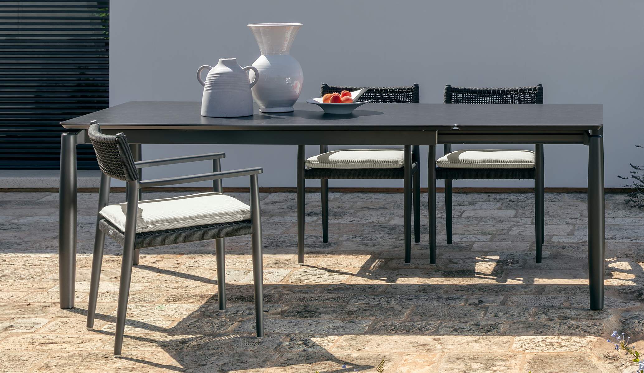 The extending dining table is the ideal solution for those who want to combine practicality and refinement in a single outdoor accessory. Designed to accommodate 8 to 10 people, this table is characterized by a stoneware top with essential lines, which extends with simplicity to offer greater capacity, adapting to any convivial occasion. The slender legs give visual lightness without sacrificing the sturdiness necessary to resist atmospheric agents. Perfect for enriching terraces, gardens and outdoor spaces, the extendable Dolcevita table is a complement with a contemporary style.