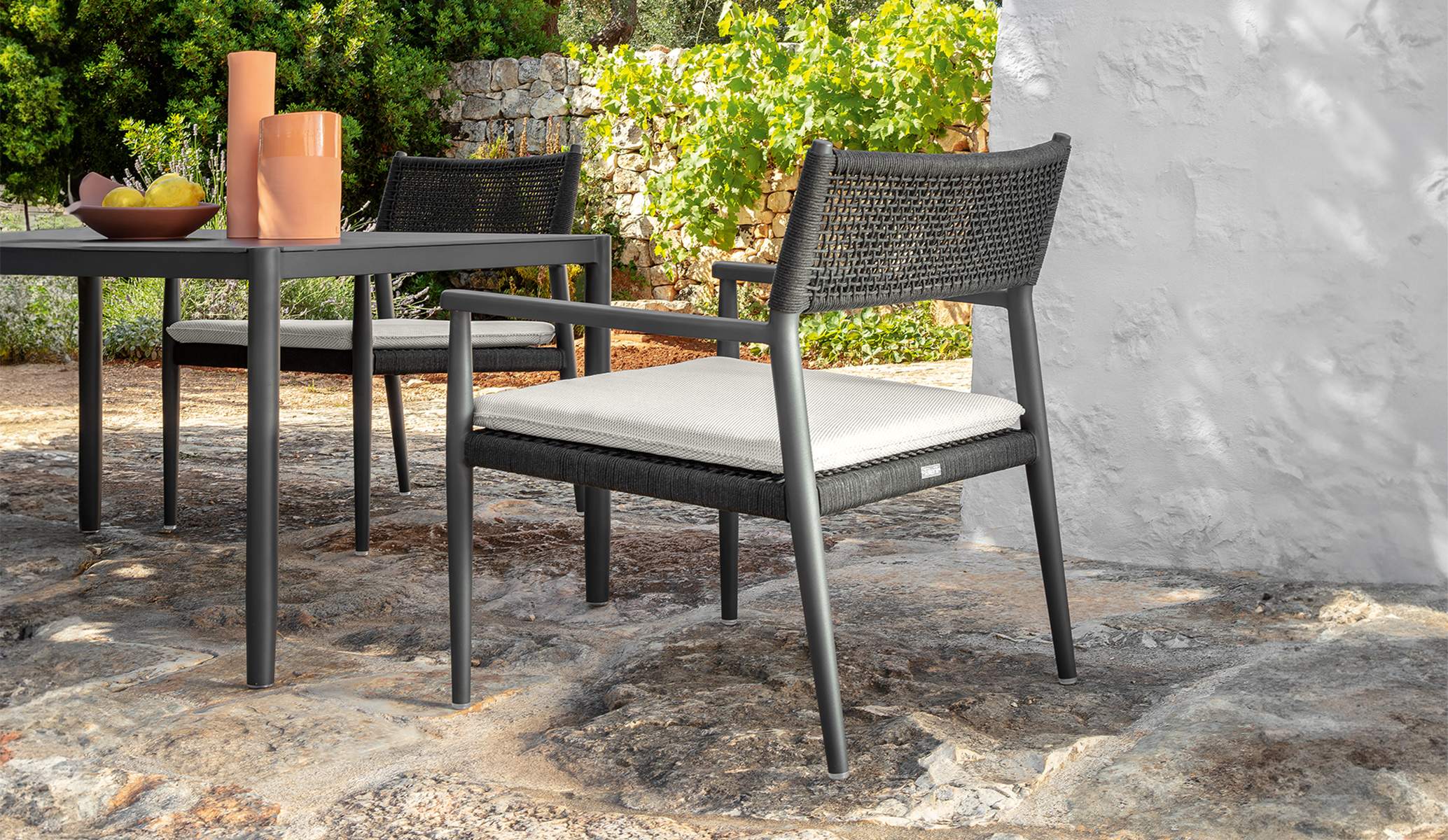 The lounge armchair represents a perfect combination of lightness and refinement. The essential design, enriched by a weave on the backrest, recalls a modern and minimal style, ideal for elegant outdoor environments. The cushion offers a contrast and makes the seat comfortable, creating a welcoming atmosphere.