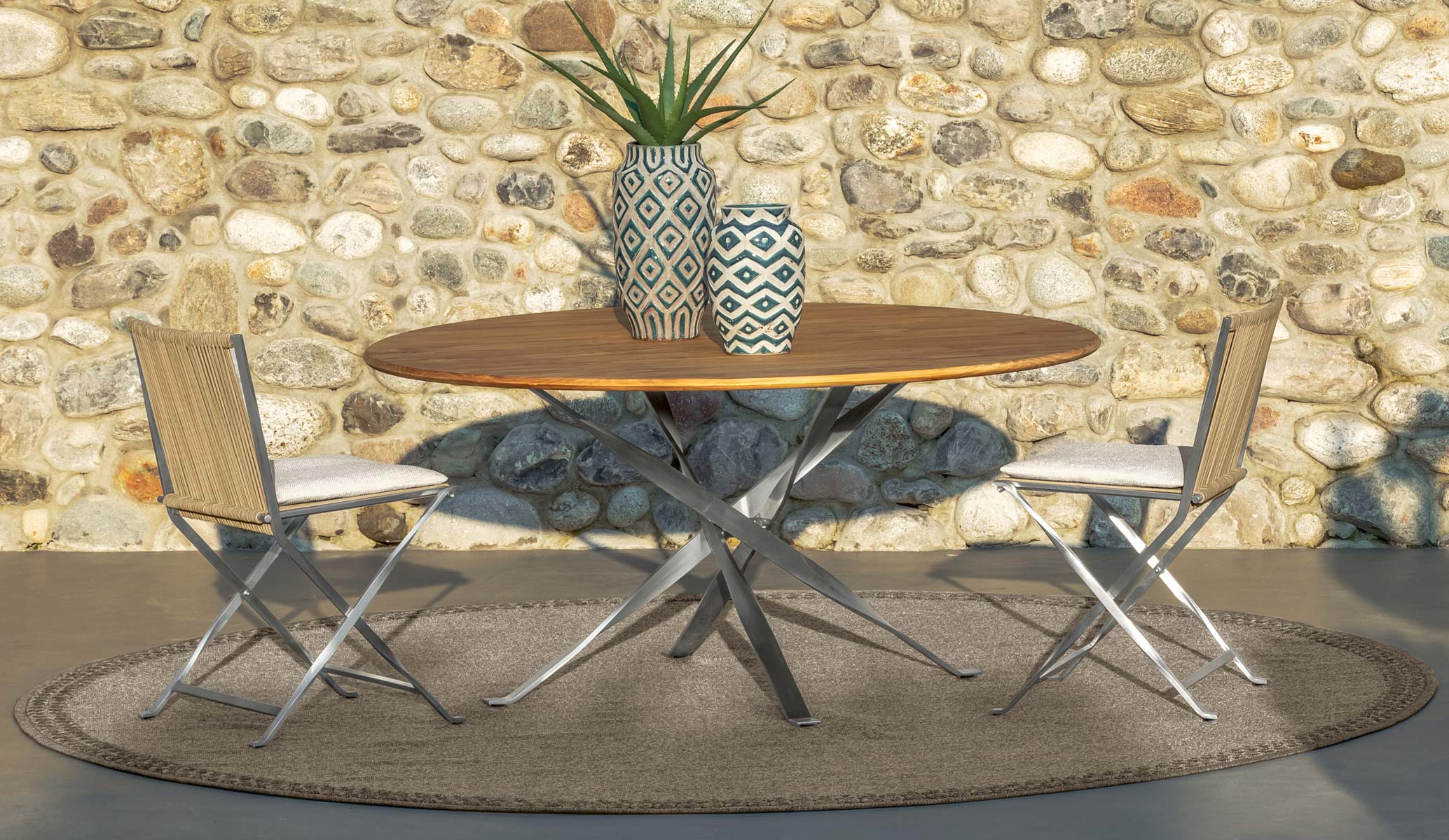 The dining chair of the George collection combines a stainless steel frame with interwoven synthetic ropes in the backrest and the seat. Thanks to a play of interlocking ropes the chair is easy to fold.