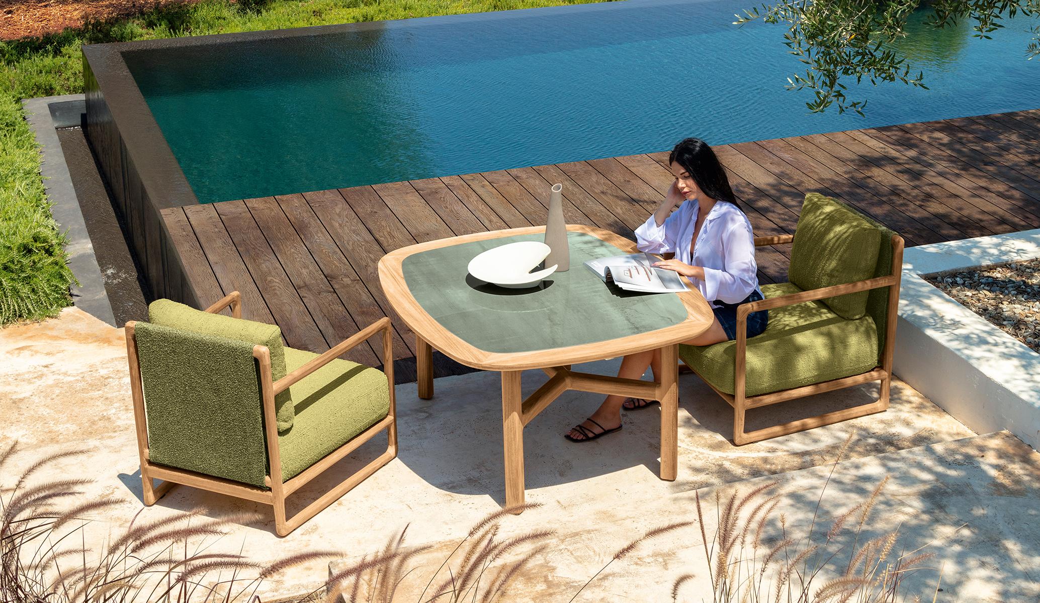 The Lounge Armchair Jun combines harmoniously comfort and sophistication in a cosy design. The generous seat and backrest covered in fabric invite you to relax, while the solid teak wood structure creates a discreet and modern elegance. Ideal for enhancing the outdoors with a touch of class, it is designed for anyone looking for a sophisticated space to relax in style.