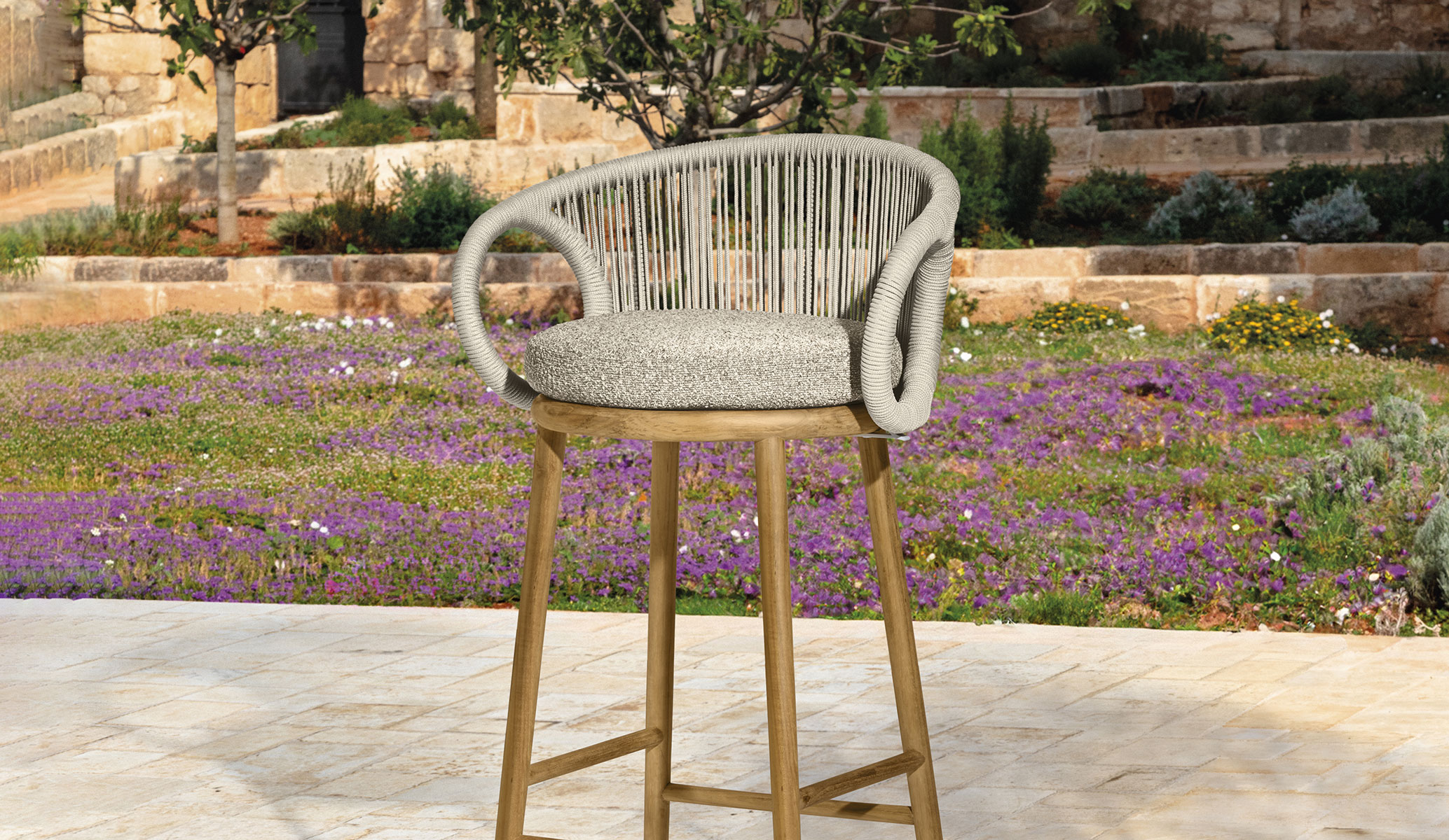 The stool of the Karen collection is a reminder of the beauty typical of African lands. Every detail, from the armrests to the rings, to the back that wraps around the seat, evokes the royalty of a throne, and at the same time inspires the feeling of a cozy retreat. This piece of furniture is able to enhance and give a strong personality to the outdoor living, thanks to the interweaving of countless threads of fabric that reveals the craftsmanship with which it was made.