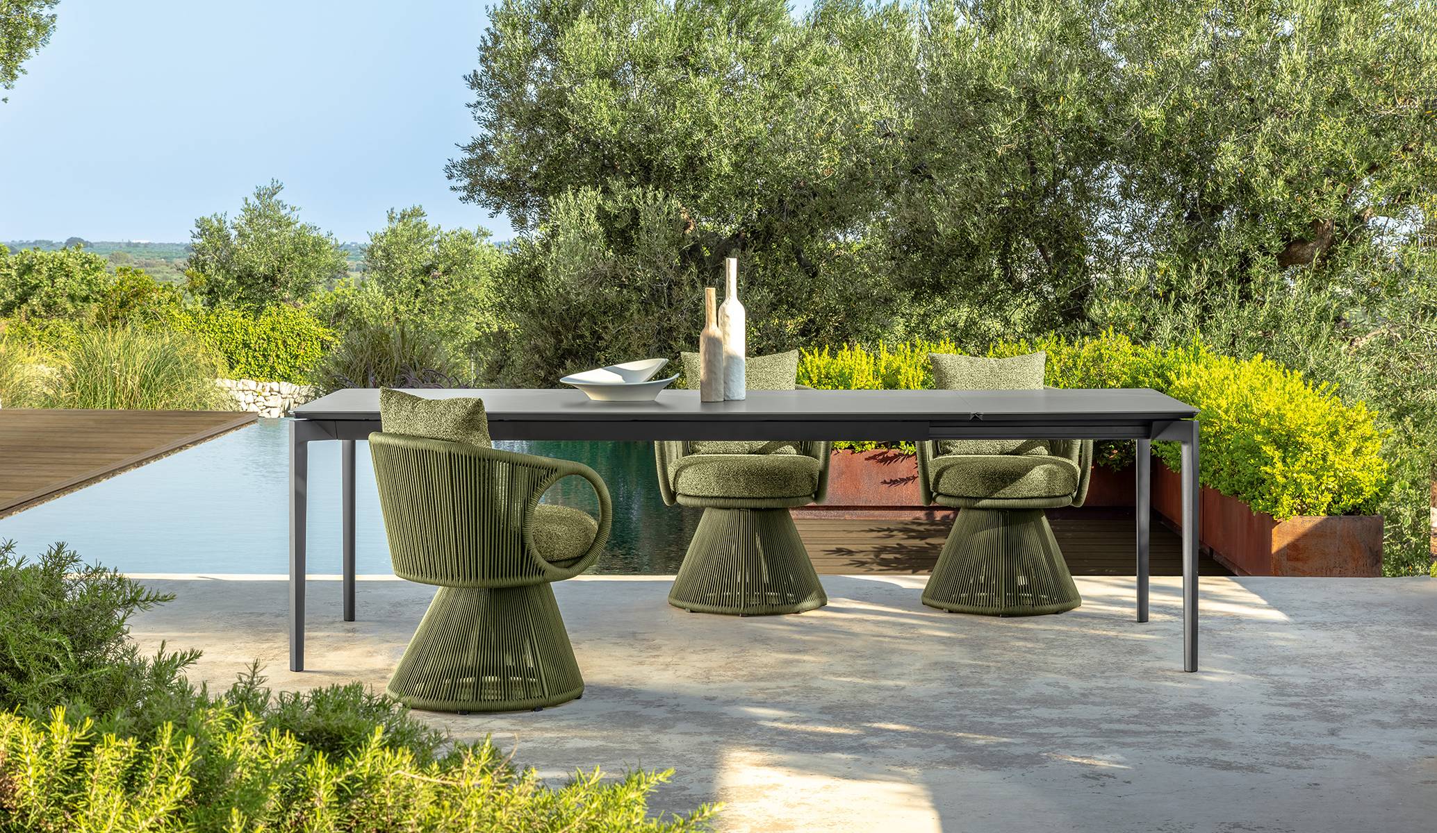 The Karen swivel dining armchair is a furniture piece that blends contemporary design and functionality. Its structure features a conical base wrapped in ropes that provide stability and a touch of elegance, while the padded seat and curved backrest ensure optimal comfort. The armchair is upholstered in high-quality fabric, and its ergonomic design is intended to provide support during meals.
