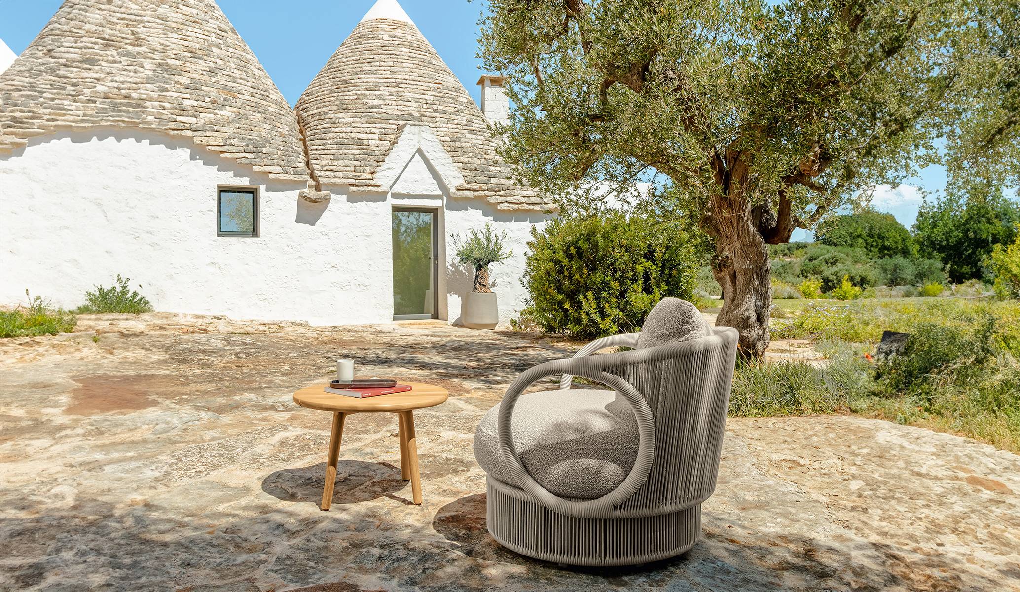 The Karen swivel living armchair is a sophisticated piece of furniture that combines comfort and style to enhance outdoor spaces. It features a round base structure with ropes, giving it a modern and attractive appearance. The padded seat and soft backrest are upholstered in high-quality fabric, ensuring a comfortable and cozy seating experience.