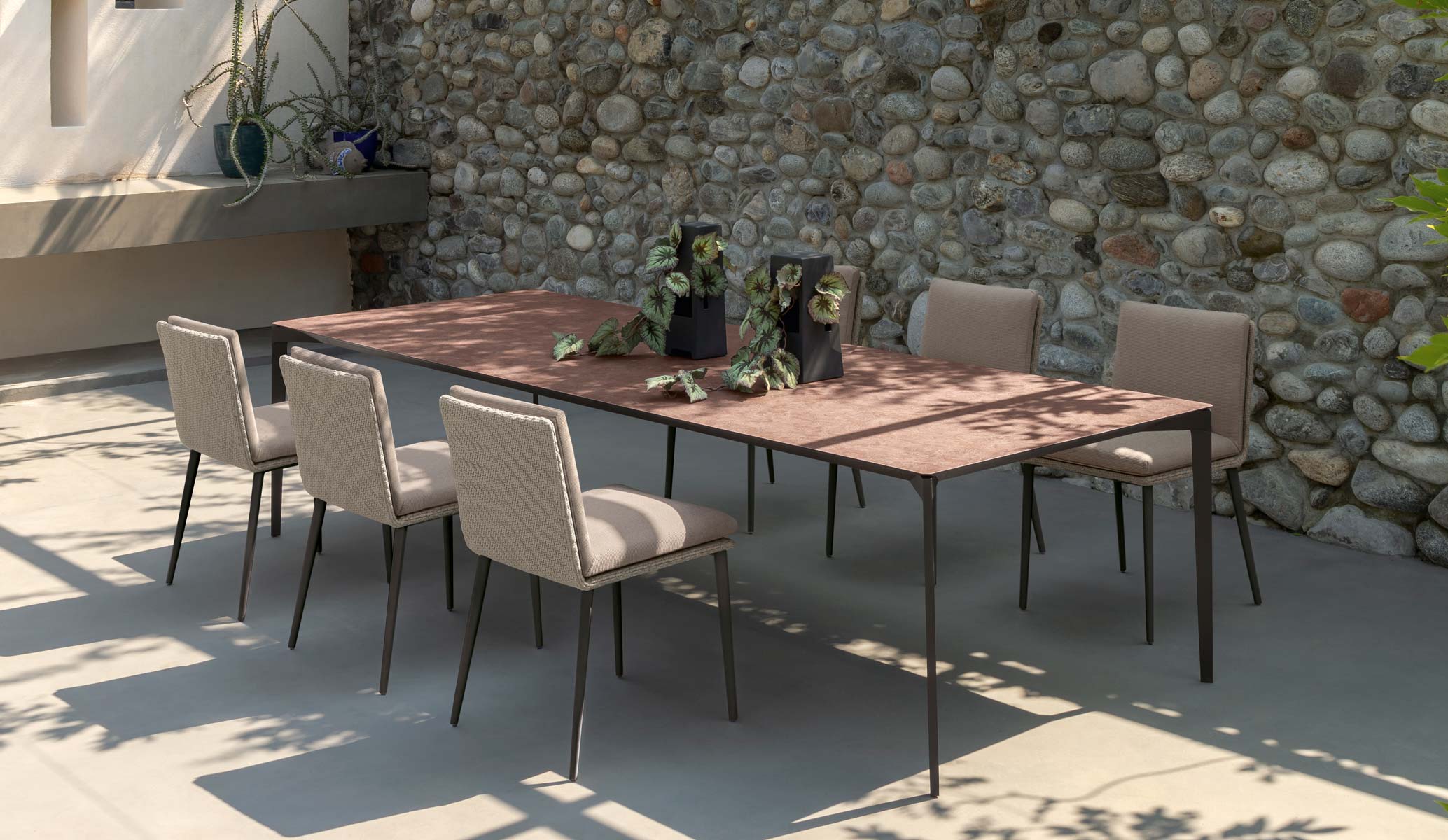 The 300×110 dining table is the centerpiece of the Leaf collection. Modern and innovative, it combines weatherproof materials with an elegant and timeless design. Its large vitter top can seat up to 12 people.