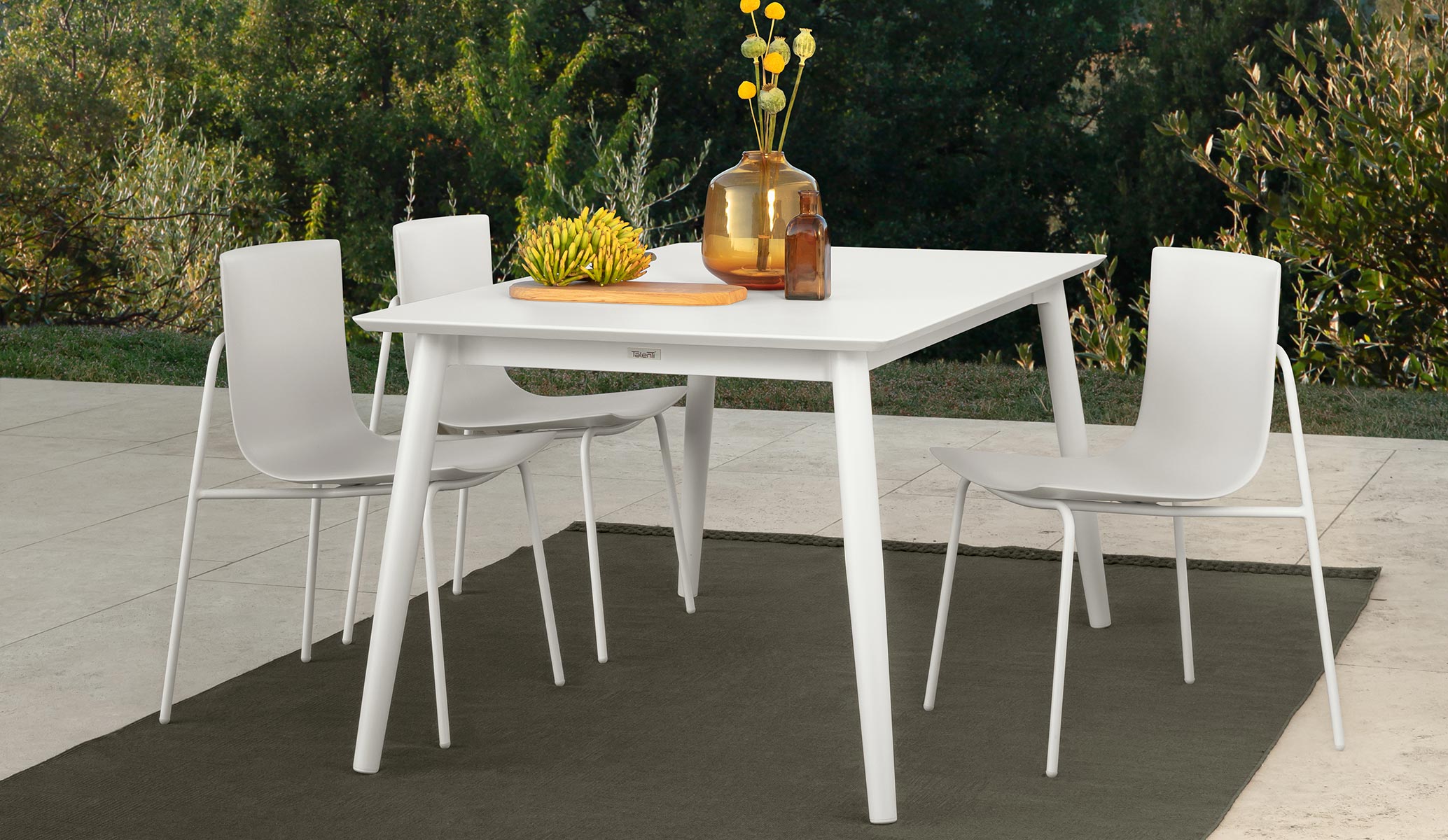 The wide seat of the Malè dining chair in plastic material is supported by a rigid and squared steel frame, making it perfect to complete your garden furniture.