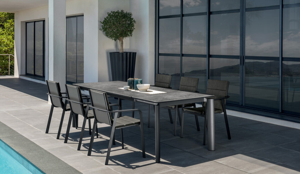 The ceramic top is the main feature of this table by Milo with a powder-coated aluminium structure. A table with a strong soul that, however, fits without arrogance the outdoor furniture. Thanks to the internal extension it can extend up to 215cm.