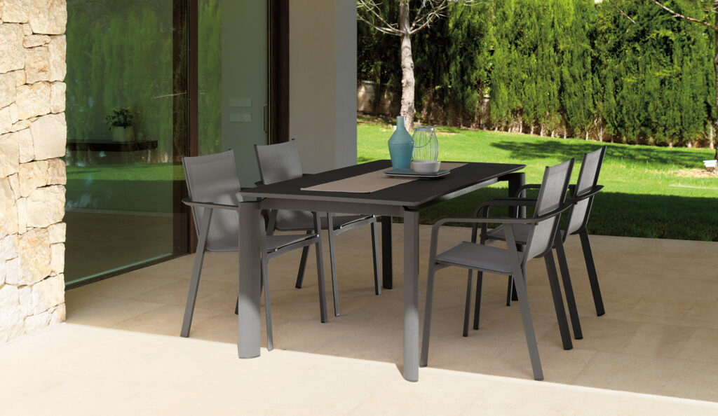 Milo dining table has been designed with the same attention to details that the tailor has when he makes a suit. The structure is in powder-coated aluminium. The table can extend up to 215 cm thanks to an internal extension.