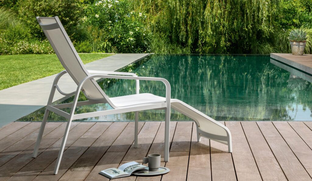 The Milo deckchair is characterised by the same modern design of all the elements of the collection. Easily stackable, it has an aluminium frame, a reclining backrest with a specific sliding system and a comfortable seat. The Milo deckchair is the ideal piece of furniture to complete your outdoor space.