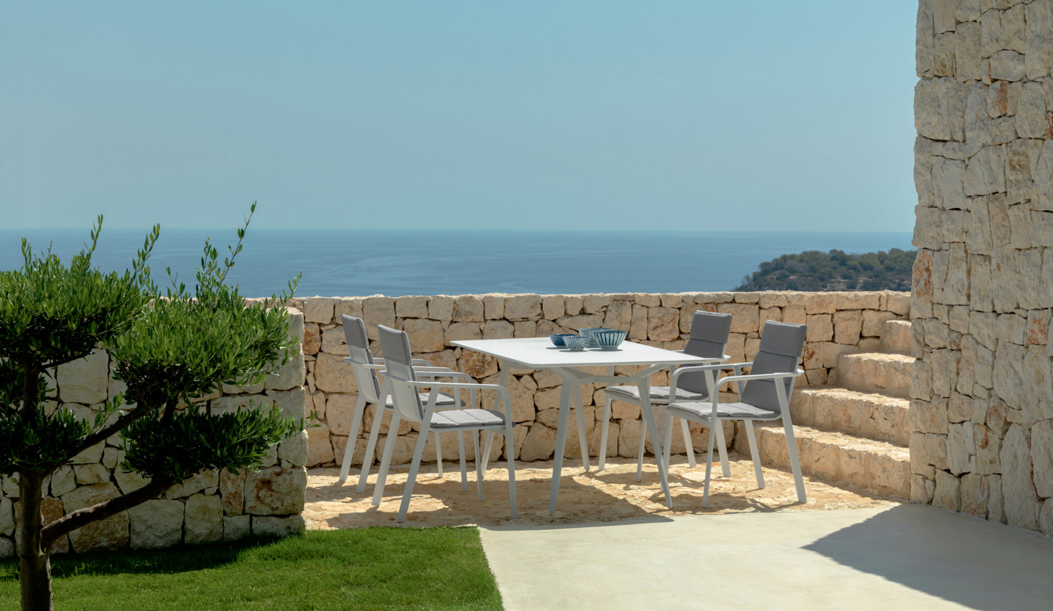 Aluminum frame and top for this elegant outdoor Milo table that perfectly matches with the Milo dining chairs to create a romantic, modern but timeless design.