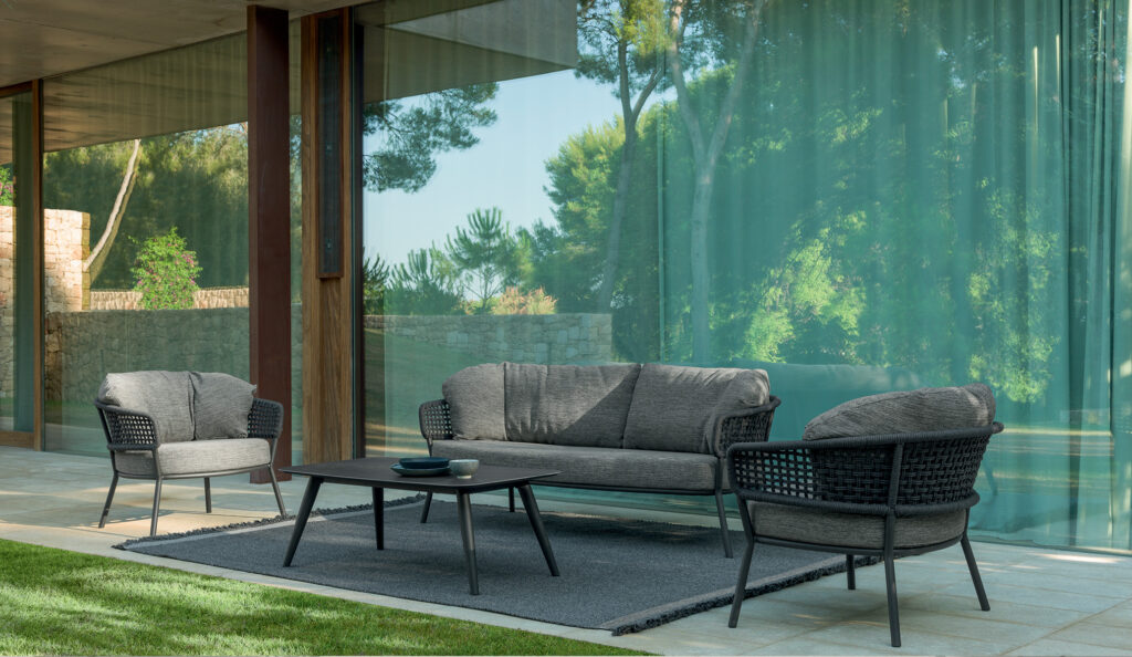 The structure is in aluminium covered with a braiding of ropes in a synthetic fabric. Cushions with a removable fabric, easy to wash and resistant to weather resistant. Quick dry foam padding.