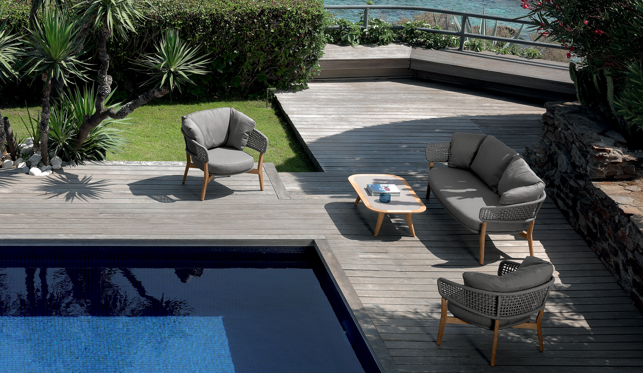 It has a natural teak structure with armrests and backrests in tubular aluminium covered with an intertwining of ropes in grey synthetic fabric.