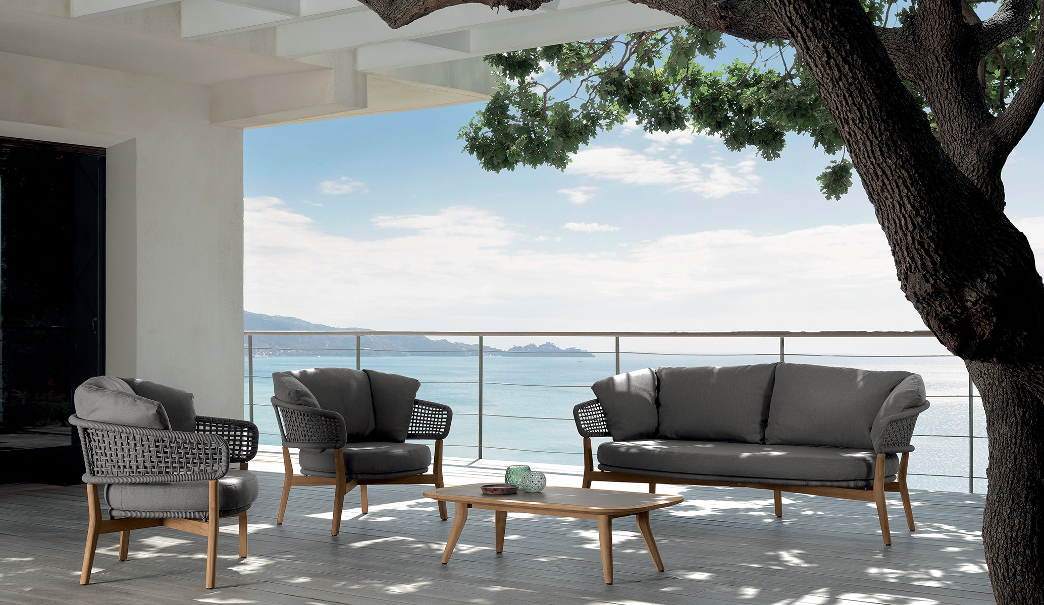 The outdoor two-seat sofa Moon was born looking at the moon. Its backrest, in fact, recalls the shape of a half moon. Lightness in the ropes braiding and resistance to the use of teak are the characteristics of this sofa designed by Cristian Visentin. It has a natural teak structure with armrests and backrests in tubular aluminium covered with an intertwining of ropes in gray synthetic fabric. Cushions with removable fabric, easy to wash and resistant to weather resistant. Quick dry foam padding.