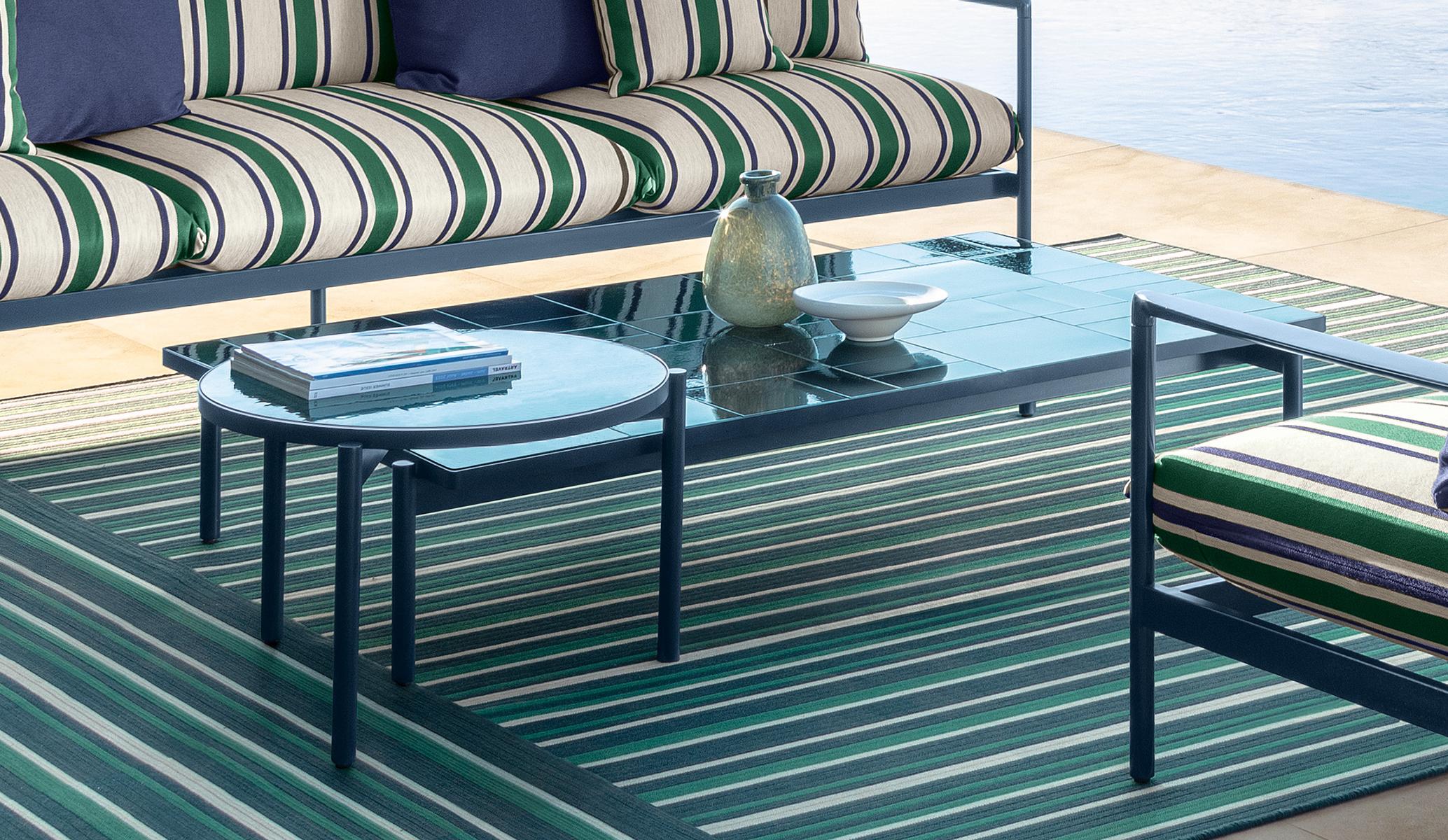 A console that overlooks the main coffee table and takes up the geometric pattern of the collection’s tops: the glazed stoneware mosaic resting on a symmetrical painted aluminium structure is a real height game that gives movement to the living area.
